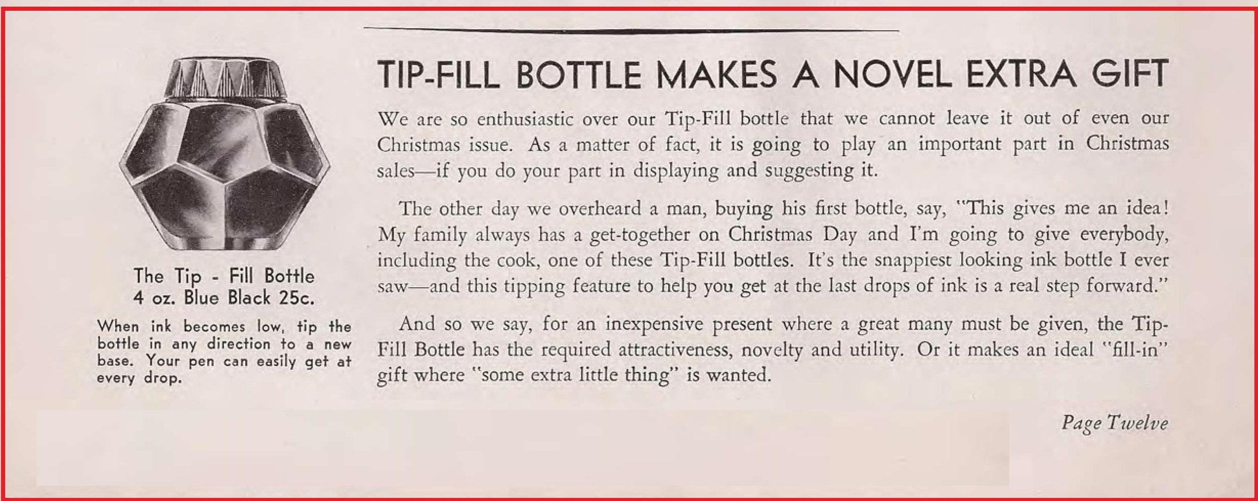 Dopo la definitiva fuoriuscita dai cataloghi americani delle penne eyedropper e delle safety (e perciò anche delle “pipette contagocce” loro dedicate e, conseguentemente dei caratteristici tappi che potevano comodamente alloggiarle in altezza, come quello visibile nell’immagine seguente tratta da una delle mie ultime recensioni) i tradizionali calamai cilindrici multiuso (da 2 e 4 once) continuarono comunque ad essere venduti richiusi con “tappi bassi” ancora fino alla seconda metà degli anni Trenta, ma come flaconi entry level, sotto la definizione di “Regular individual desk size containers” (contenitori standard individuali da tavolo).