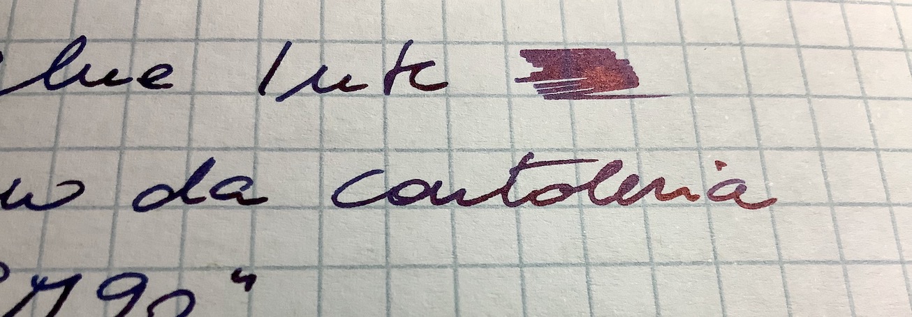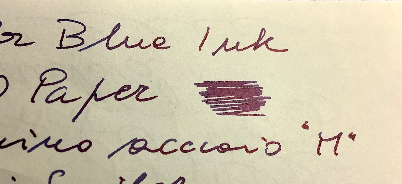 il Majestic blue gli somiglia come comportamento, anche lui molto saturo, intoppa le penne, produce sheen, sbava su carta patinata, va leggermente diluito se occorre. Sulla carta da fotocopia va bene, perché in genere più porosa e assorbe.