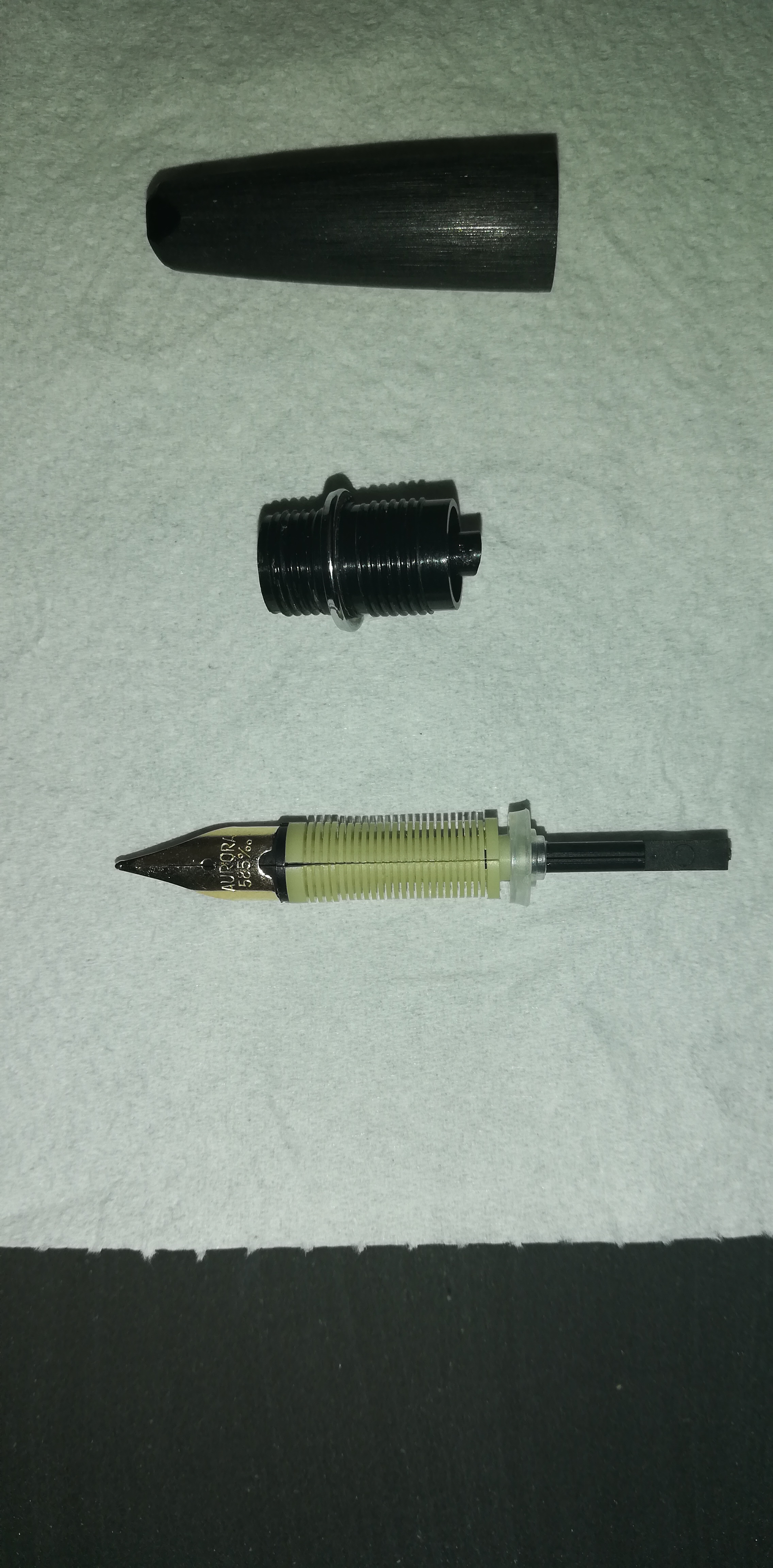 Nonostante i suoi interventi di smonta e rimonta, quando ho ricevuto la penna non sono riuscito ad aprire la sezione, trovando resistenza del collarino nel tentativo di svitarlo. Ho quindi provveduto a mettere a bagno la sezione intera in acqua tiepida con concentrazione di detersivo per piatti variabile in crescita, senza peraltro arrivare al mio obiettivo. Sono quindi ricorso al phon per capelli che mi ha permesso di sbloccare il collarino. Ho poi rimontatato la sezione dopo aver lubrificato filettatura e veretta nel punto di contatto con la sezione con grasso al silicone, al fine da evitare successive future difficoltà.