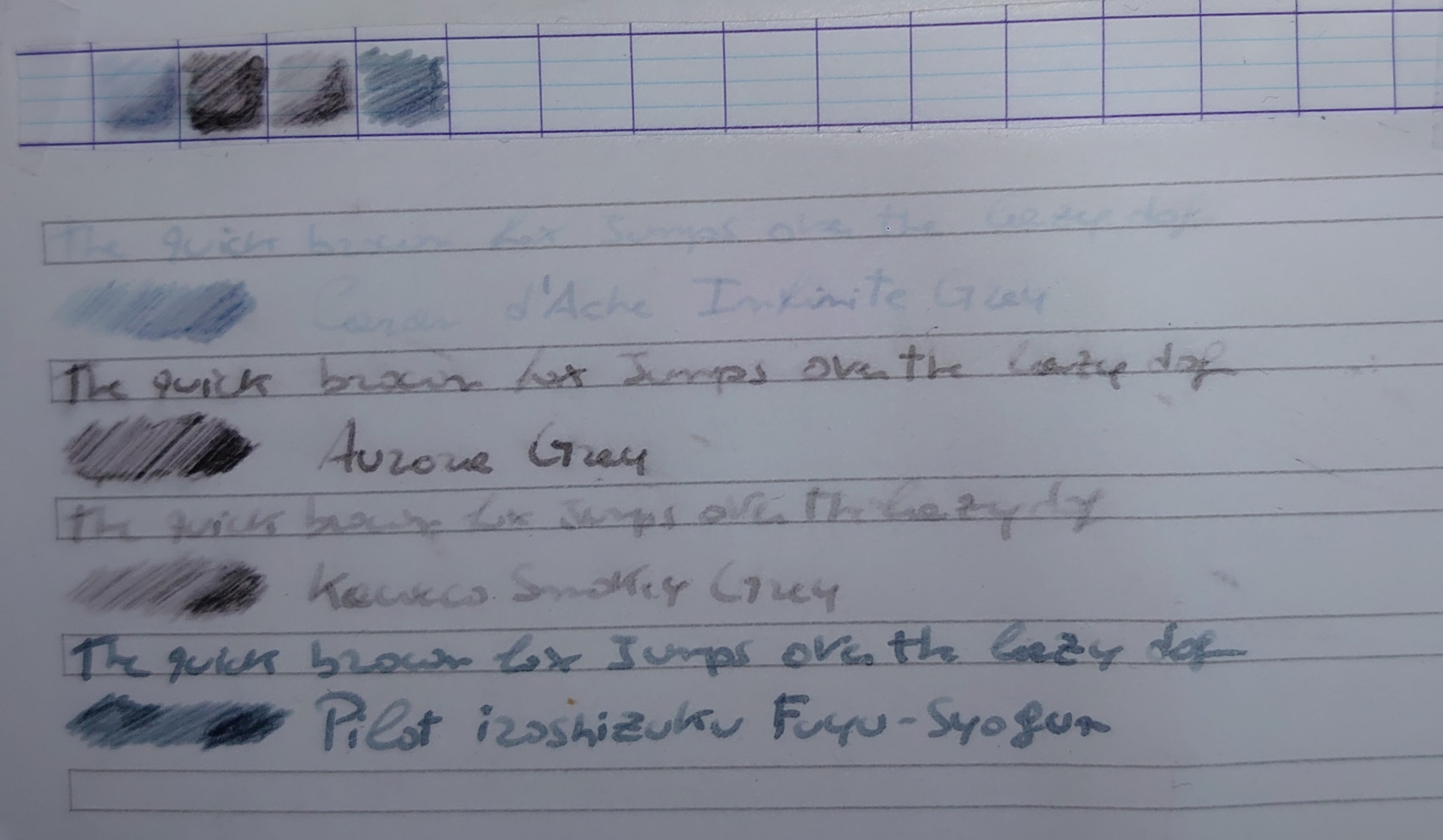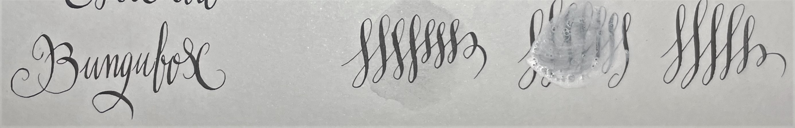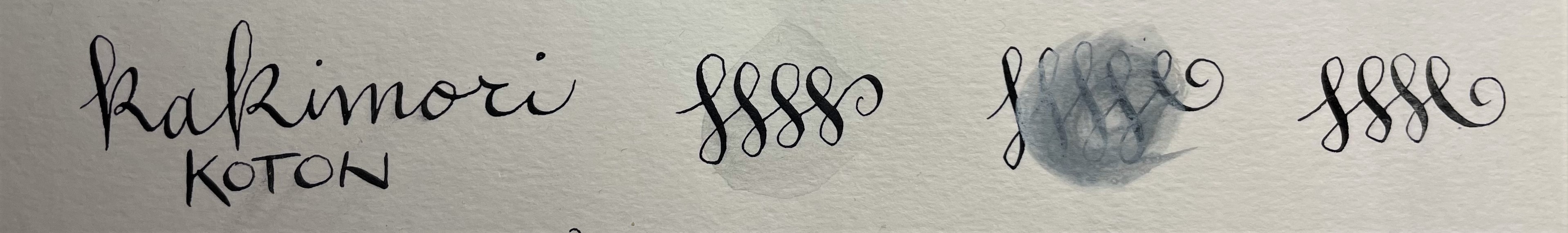 come sopra, da umile utente con una gocciolina, suggerisco pure il Bungubox, un altro inchiostro giappo e costoso ma che resiste bene all'acqua. Tende un po' al blu scurissimo come dominante, ma è nero nella stesura. Rimane leggermente lucido quando asciuga.