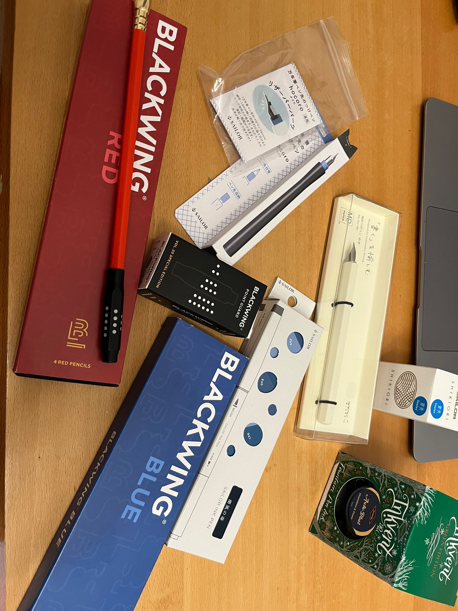 - Sailor hocoro dip pen + alimentatore: permette di scrivere 3 pagine A5 fitte di testo con una sola intinzione nell'inchiostro. Molto comoda e piacevole da usare (un po' leggera per i miei gusti). Un modo per provare gli inchiostri
