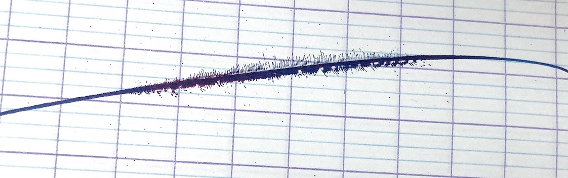 Comunque non mi volevo tanto soffermare sullo stridio di in pennino , ma più sul fatto di poter lasciare sulla carta quella scia di piccole linee e di goccioline disperse. E' un effetto che ogni tanto (anche se raramente) si vede in qualche video del tubo quando ad esempio chi scrive traccia velocemente ad esempio una lunga stanghetta della lettera "t" (forse anche in un video di Chiari , quando prova un vecchio pennino flessibile).