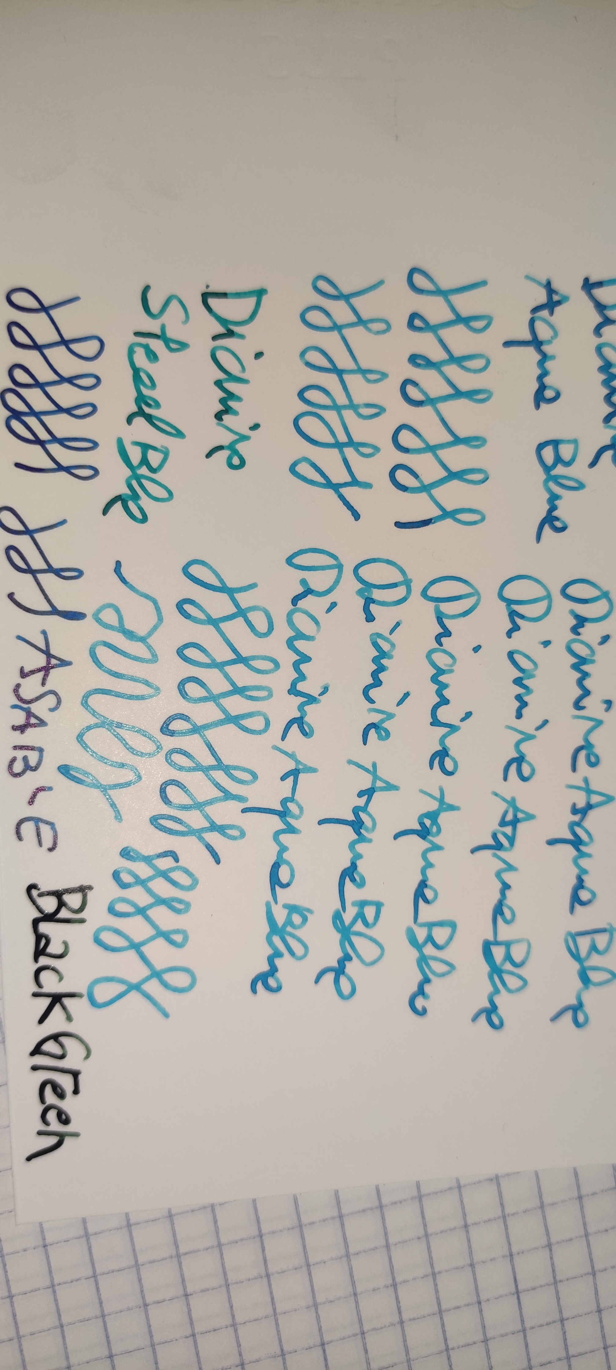 Il cartoncino è diventato il mio strumento di prova inchiostro preferito attualmente. Non ho ancora trovato una carta che gli si avvicina per quanto riesce a rendere belli i miei inchiostri. Guarda il Diamine Aqua blue che ho recensito su carta rhodia rispetto a questo cartoncino