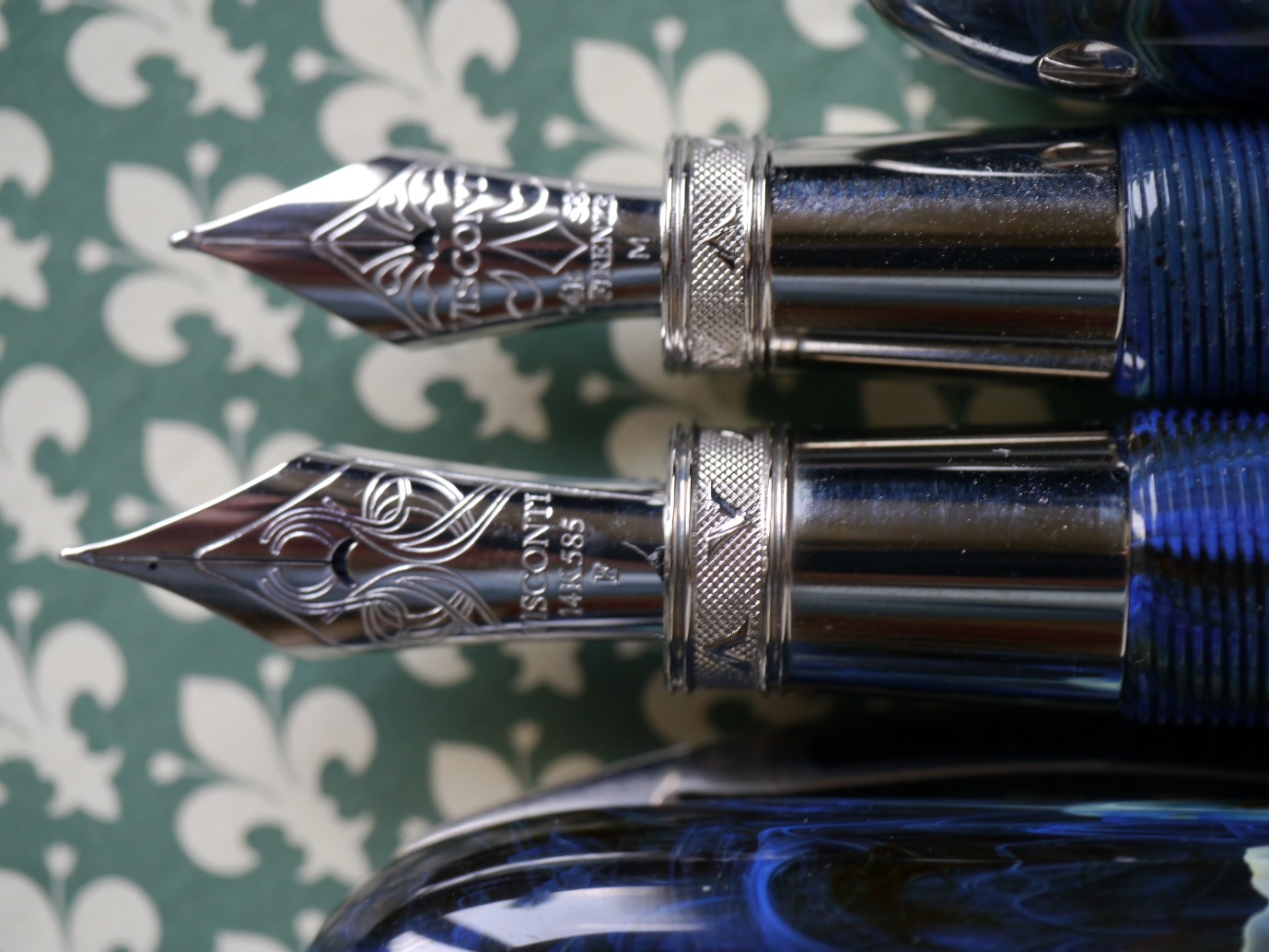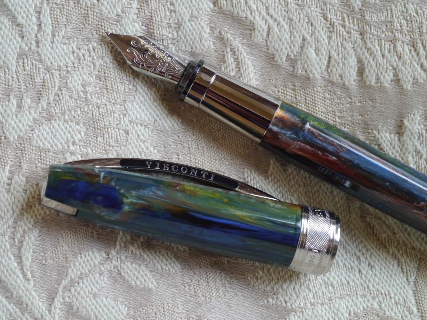 è vero, sono belle, anch'io ho la Starry Night. La mia scrive dignitosamente anche se il pennino non è un pennino stratosferico... è un buon 076 in acciaio della Bock marchiato Visconti, anche questo è un M, non esagerato. E' abbastanza rigido, ma scorrevole. E' lo stesso pennino montato sulla Kaweco Dia II.