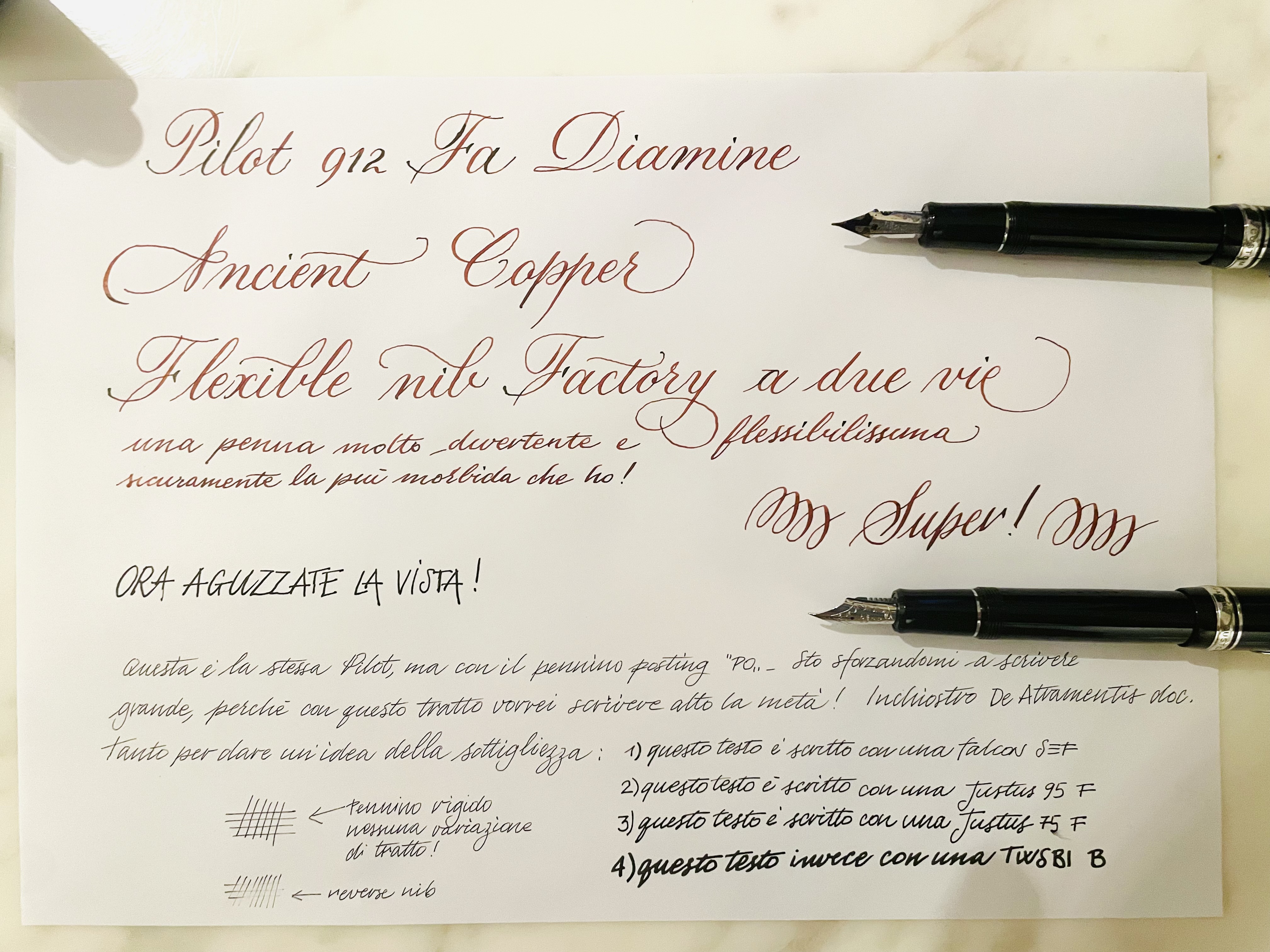 La prima gemella è una Pilot Heritage 912 FA, modificata con un alimentatore a due vie in ebanite preso in America. Senza questo indispensabile accessorio era la regina del Railroad. L'ho caricata con un diamine ancient copper e mi sono divertito a scarabocchiare in corsivo, anche se non lo so fare. Ma questa penna burrosa ti porta agli svolazzi.