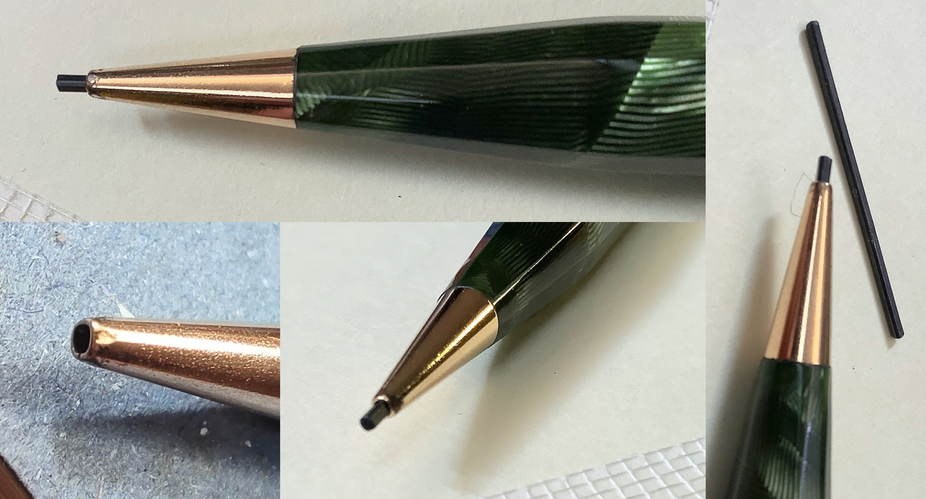 Qualche particolare del puntale e mina "quadrata" . Sebbene siano ancora disponibili le mine quadrate originali Eversharp nei soliti circuiti di vendita su internet, è anche possibile utilizzare comunque le classiche mine tonde dal diametro di 1,18 mm. La mina è fatta uscire dal puntale semplicemente ruotando in senso orario la parte superiore della matita, mentre la rotazione antioraria farà ritrarre la mina.