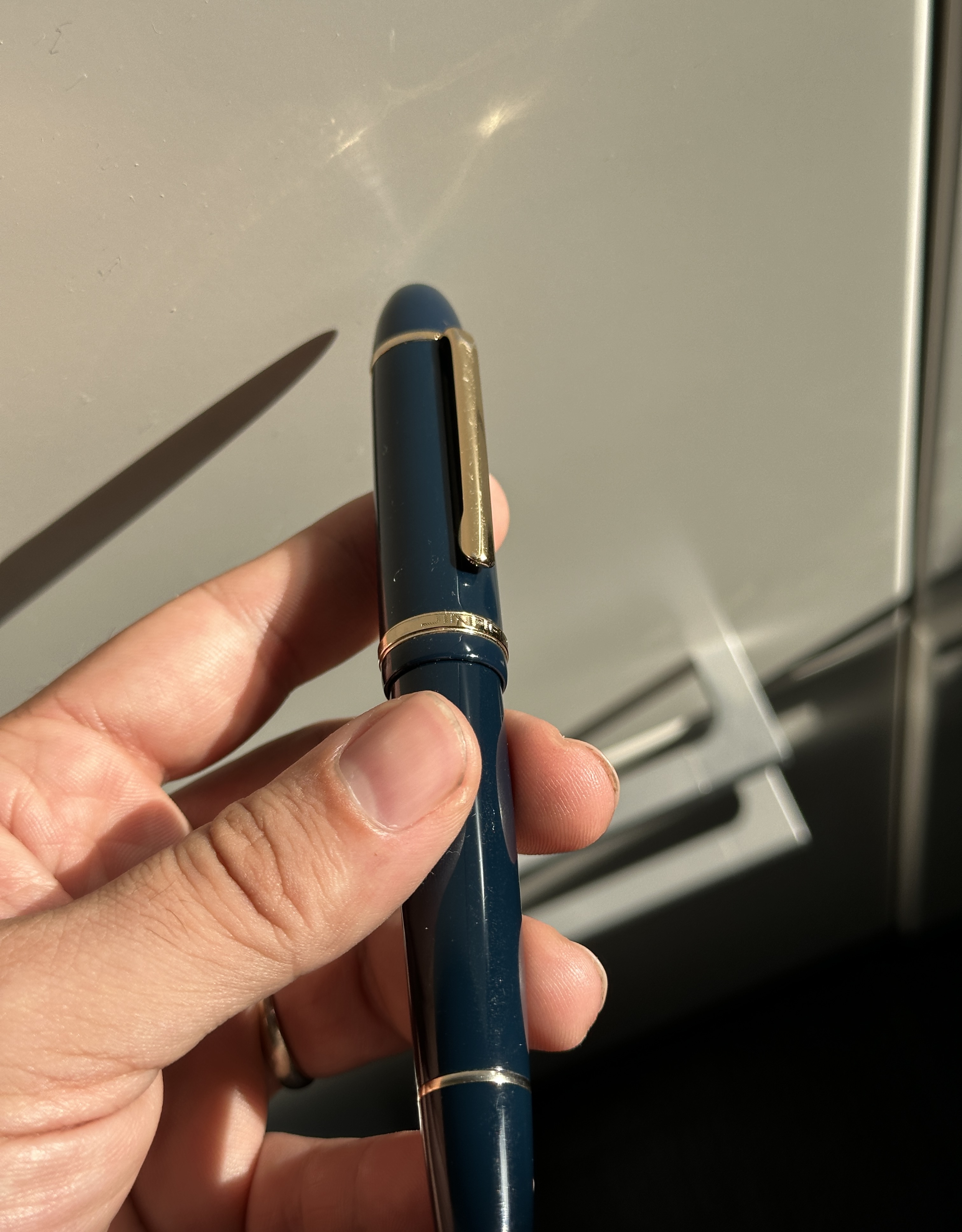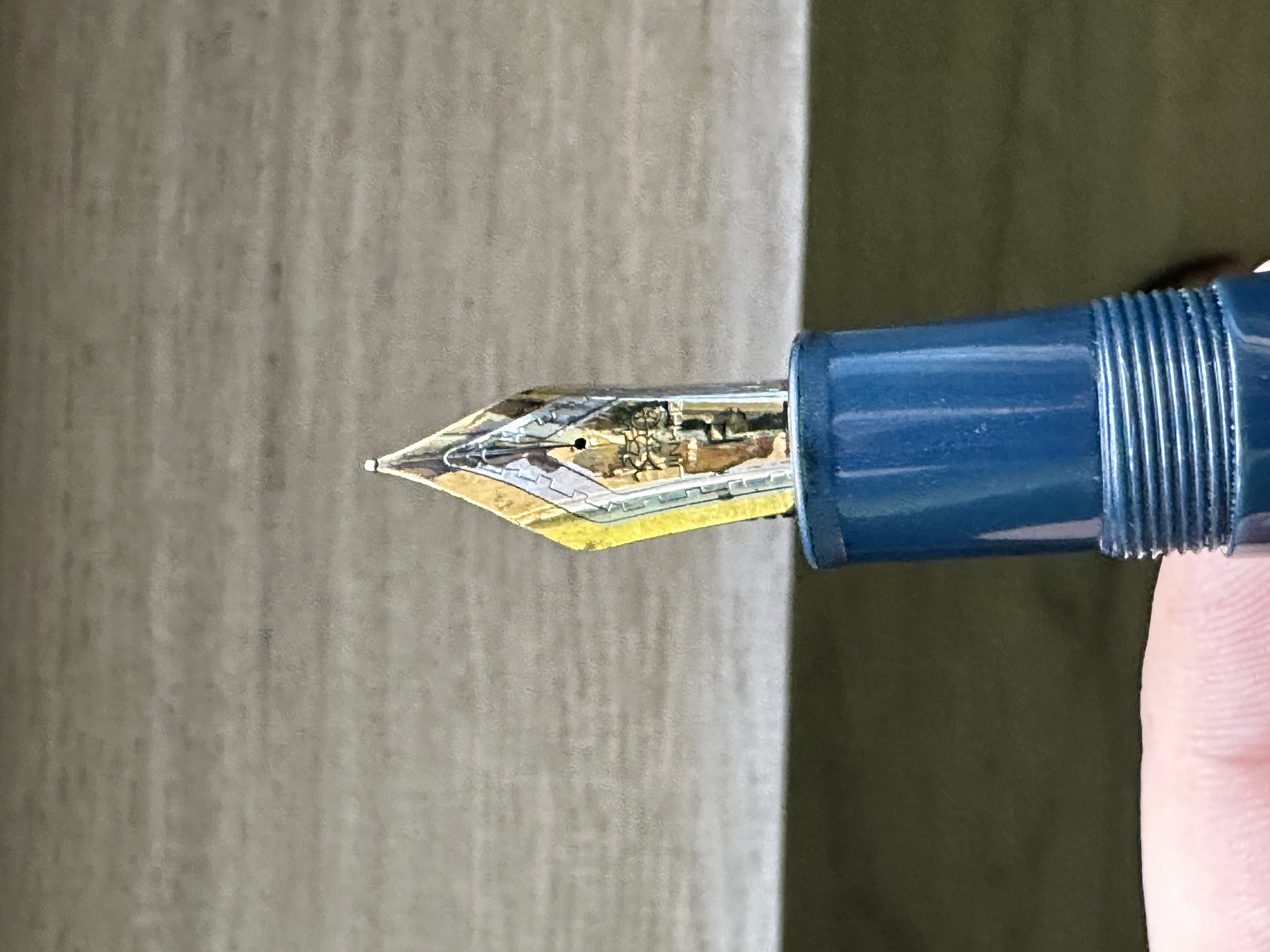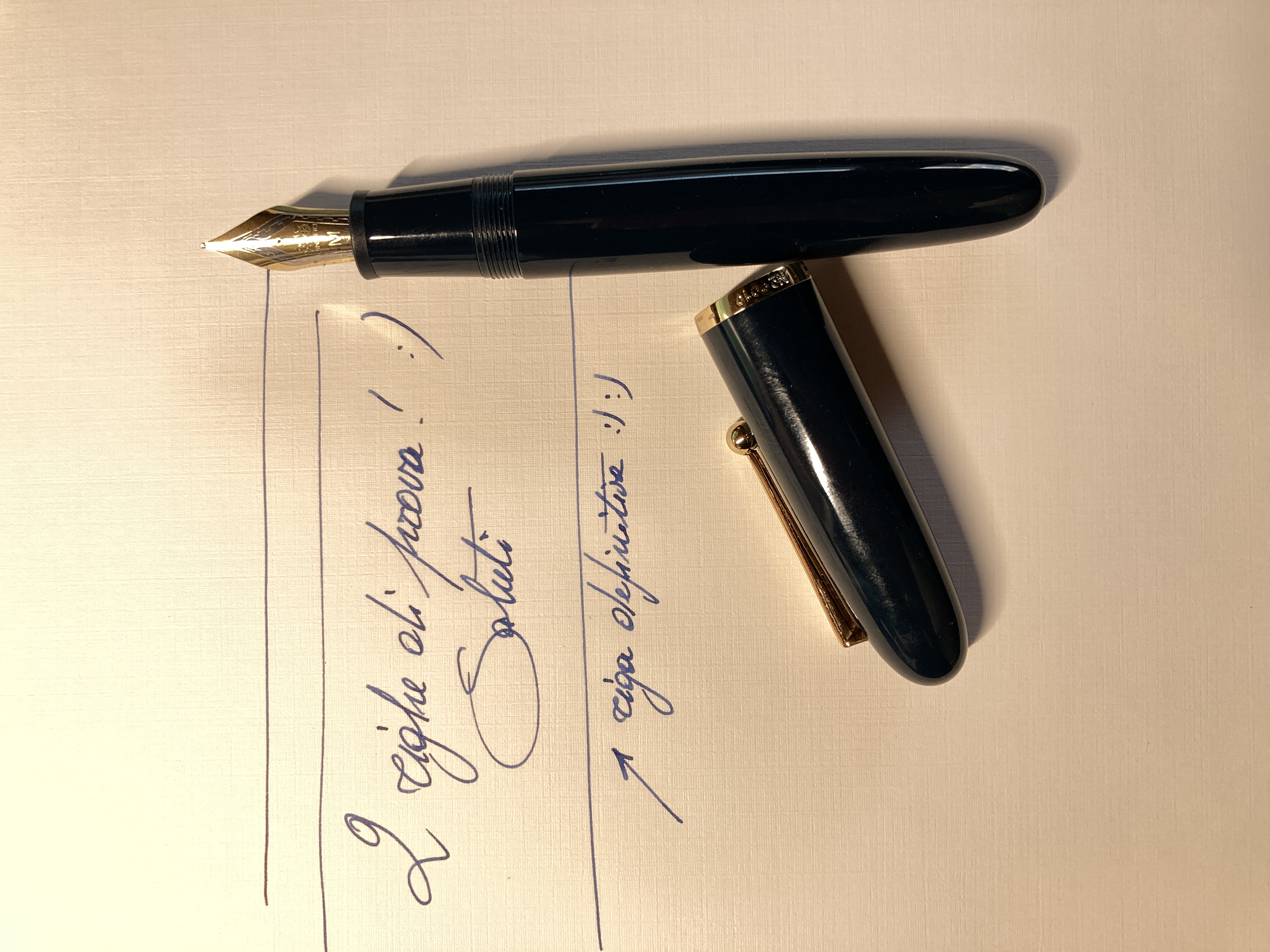 Arrivata oggi. Blu scuro con finiture dorate. Bella grossa e pare fatta bene, solida. Bello e capiente il converter con attacco a vite. Giunta con pennino perfettamente regolato, caricata con Waterman Bleu Mystere sta scrivendo senza incertezze (ho preso il pennino M). Come per la X159 hanno frapposto un o-ring tra sezione e fusto. Per ora sono molto, molto soddisfatto :wave: