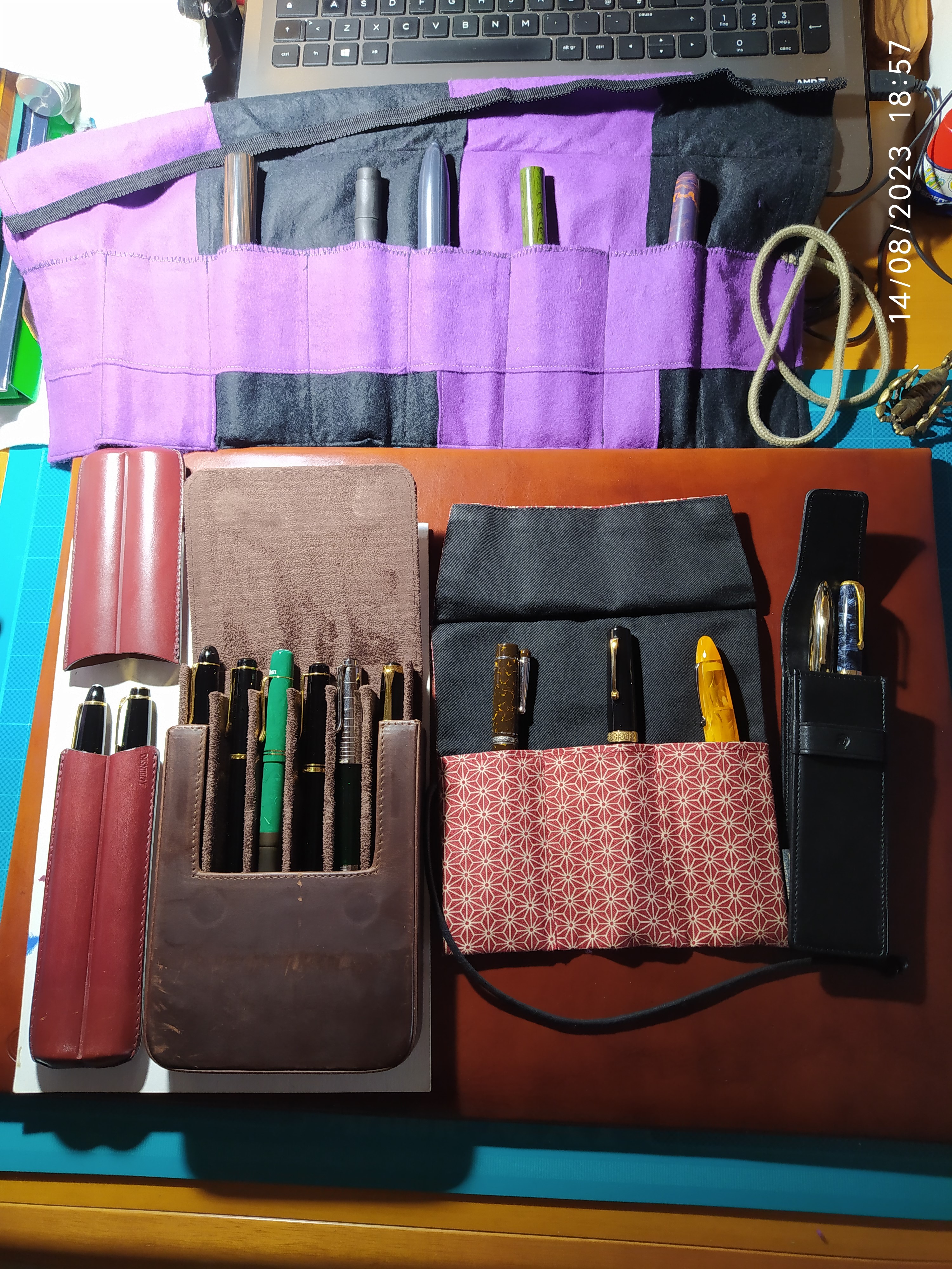 da sinistra : vecchio portasigari marca Lubinski riciclato; portapenne da sei posti in pelle marca boh (nel senso che non la sò :D ); Saki rollo da tre posti e ultimo lo Staedtler in pelle da due posti.IMG_20230814_185739.jpg