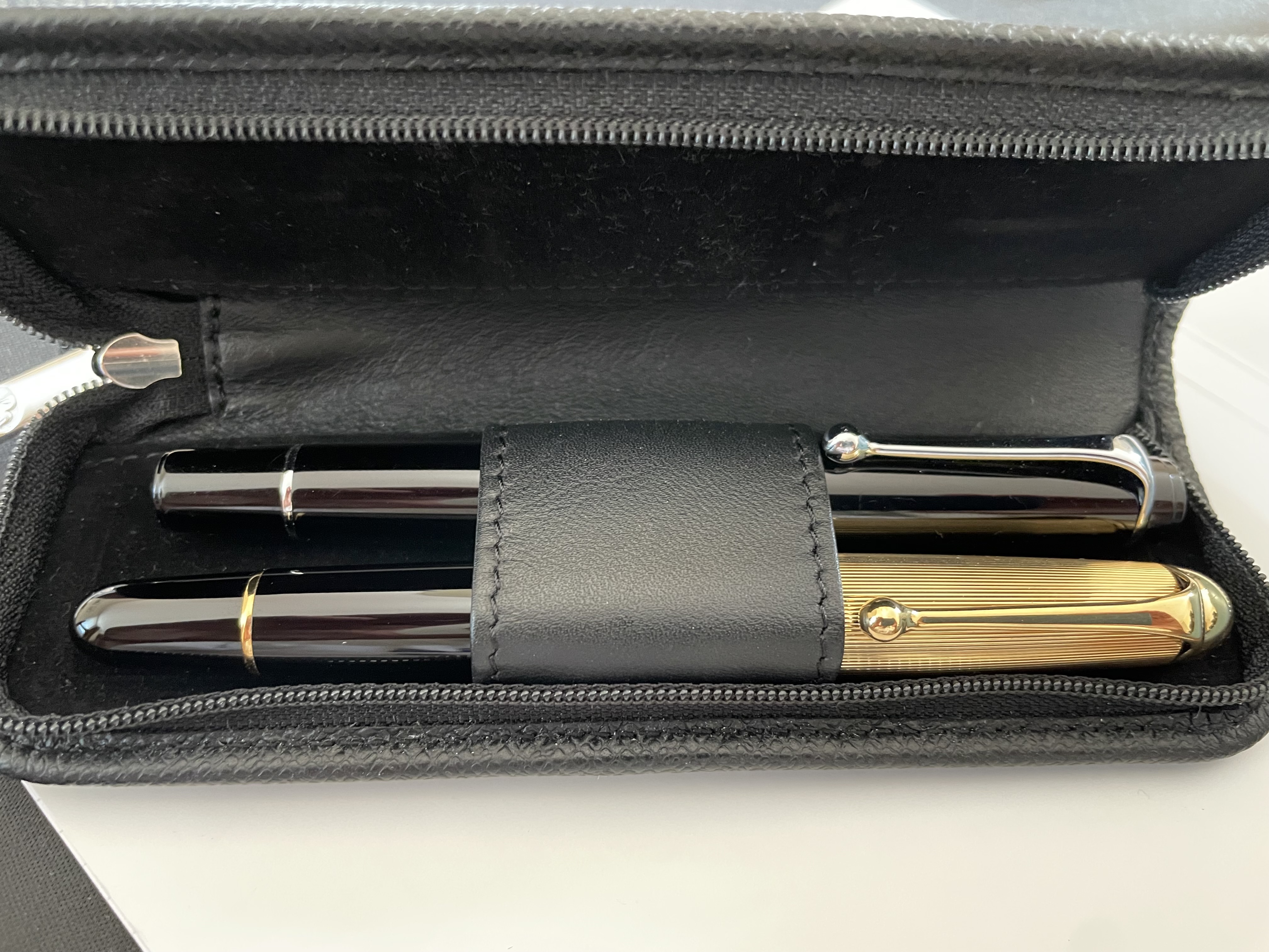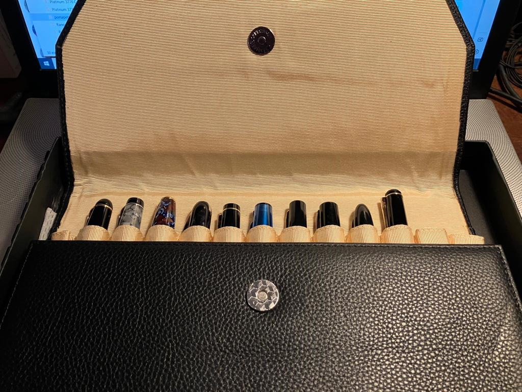 Io ho preso questi portapenne in pelle Pelikan, la pelle è morbida e di ottima qualità, il primo è per tre penne, quelli ad astuccio invece sono per due.