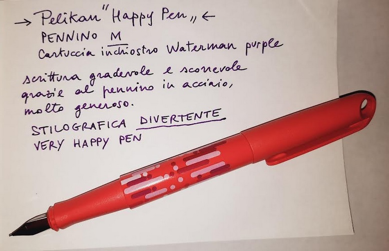 Ho una Pelikan Happy Pen comprata all'Ipercoop per credo 6 euro e mi piace molto perché è leggera e affidabile. La trovo estremamente comoda, non mi affatica, il pennino M in acciaio è senza pretese eppure dà soddisfazione, scorre, scrive. E' una stilografica pensata per i bambini e forse se la apprezzo così tanto è perché ho le mani abbastanza piccole (dita lunghe, ma mani piccole).