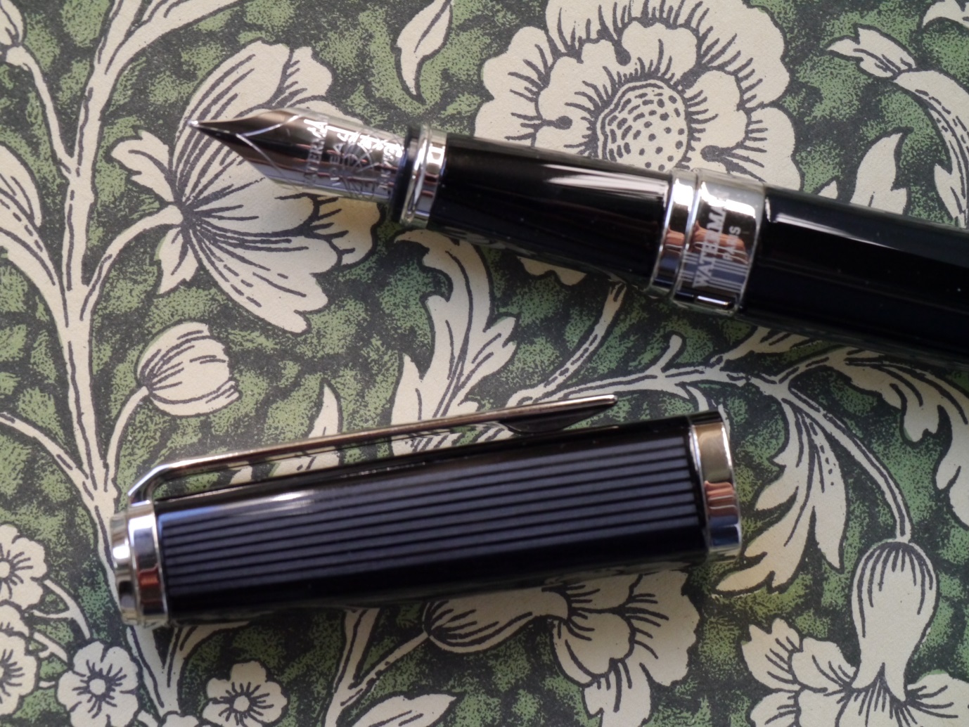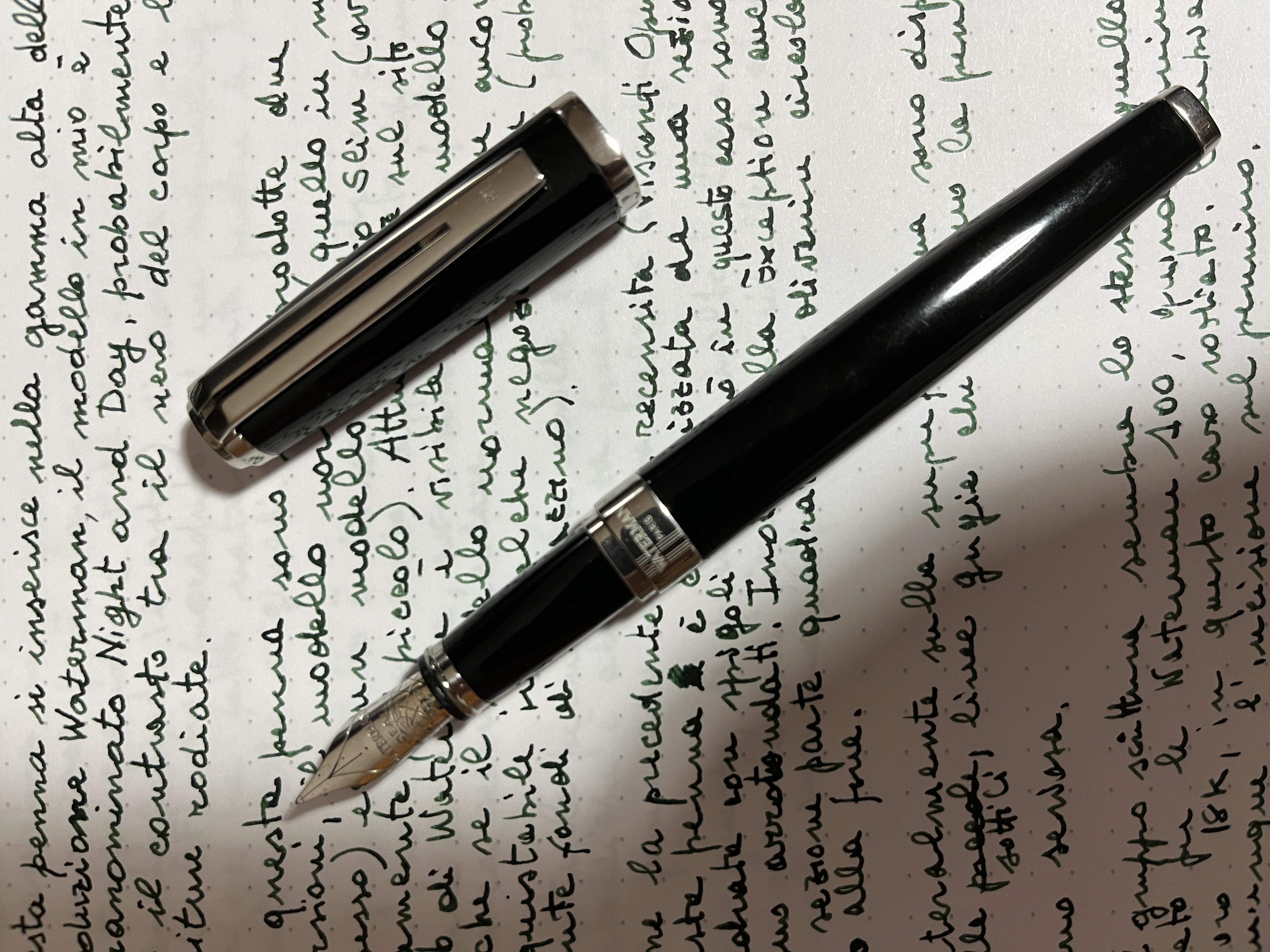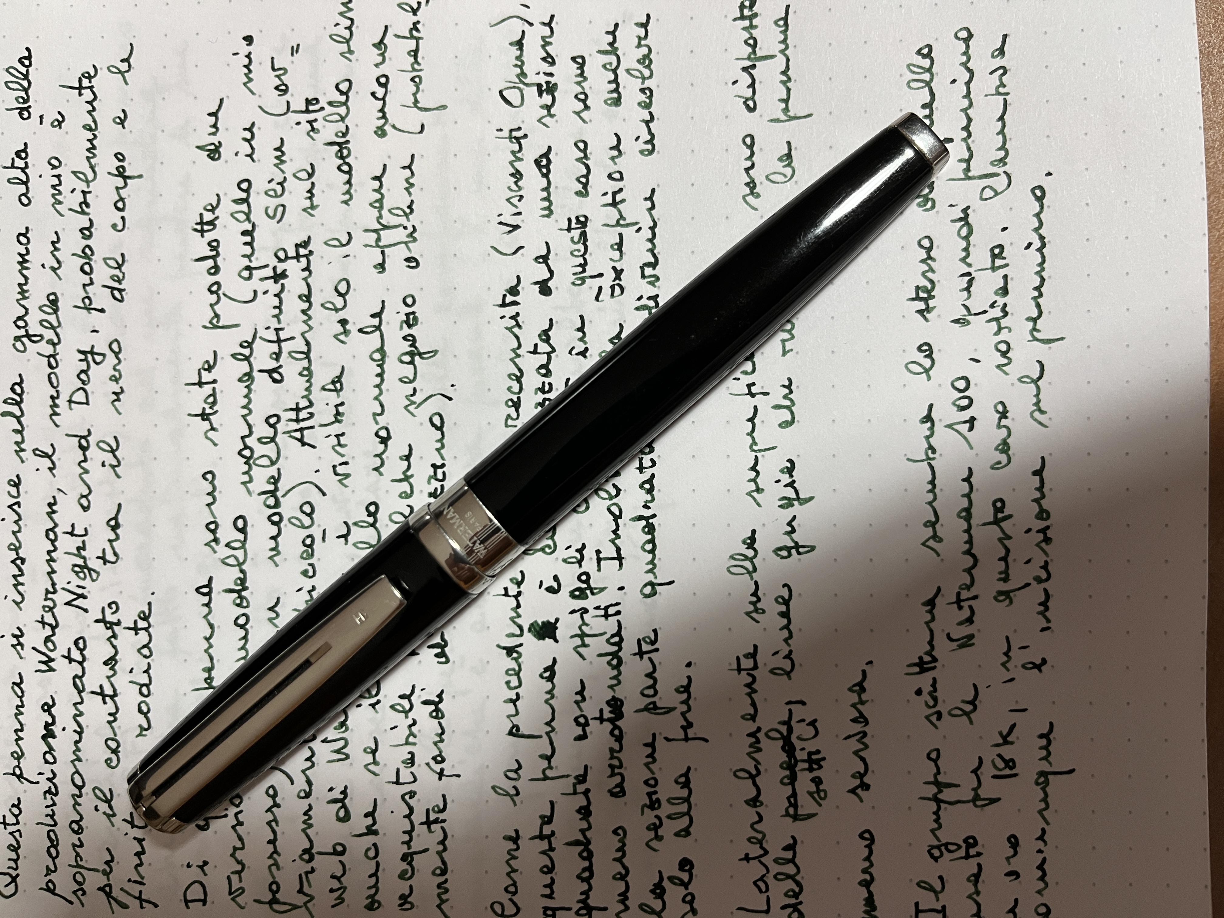 Questa penna si inserisce nella fascia alta della produzione Waterman, in particolare il modello in mio possesso è quello chiamato Night & Day, probabilmente per il contrasto tra il corpo nero, le finiture rodiate e le sottili linee grigie laterali (rispetto alla posizione della clip e del pennino) al corpo della penna.