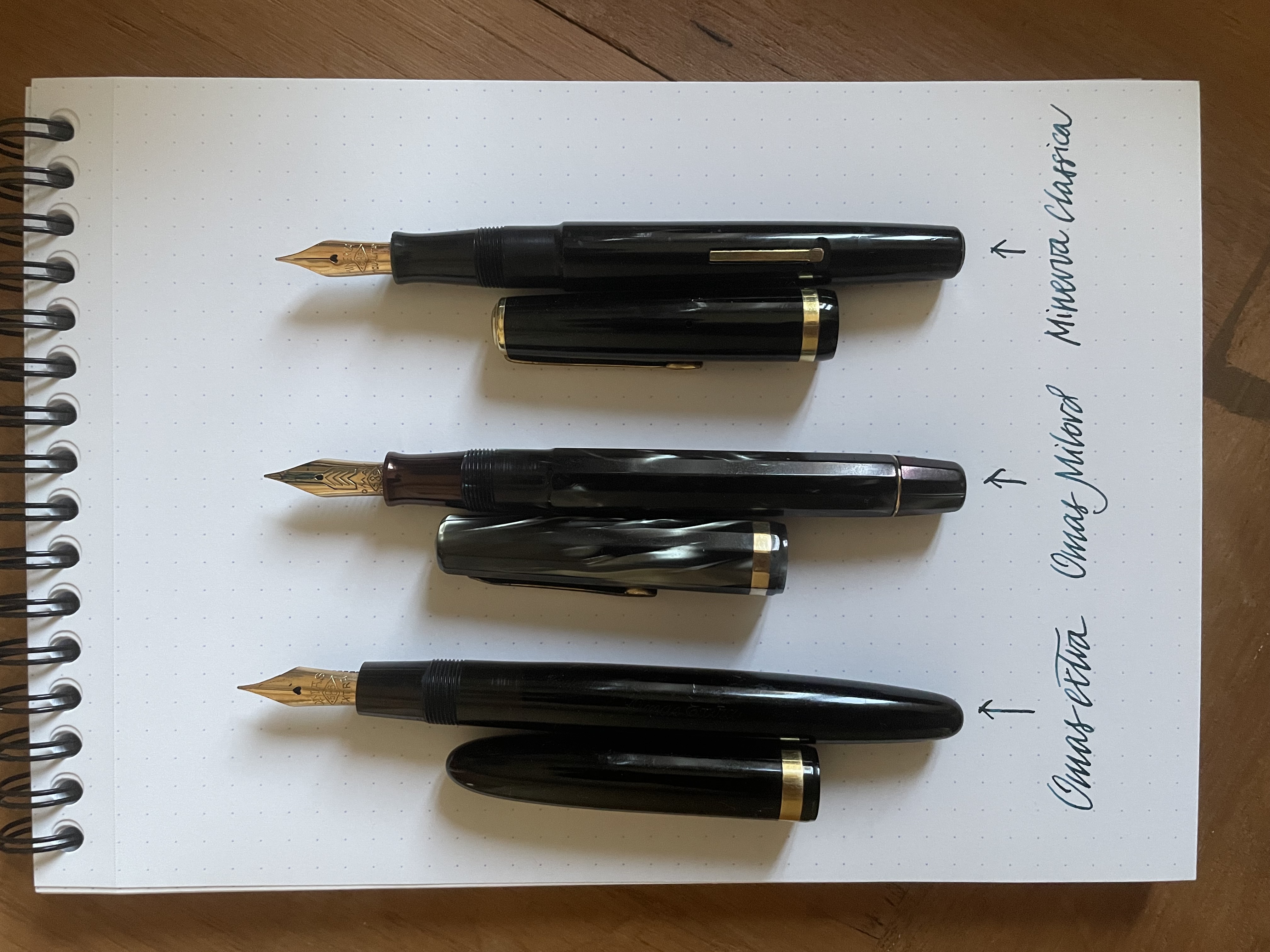 La metto qui a confronto di due sue “gemelle diverse” che uso molto spesso: un’Omas Milord con pennino extra Lucens e una Minerva Classica, tutte EF.