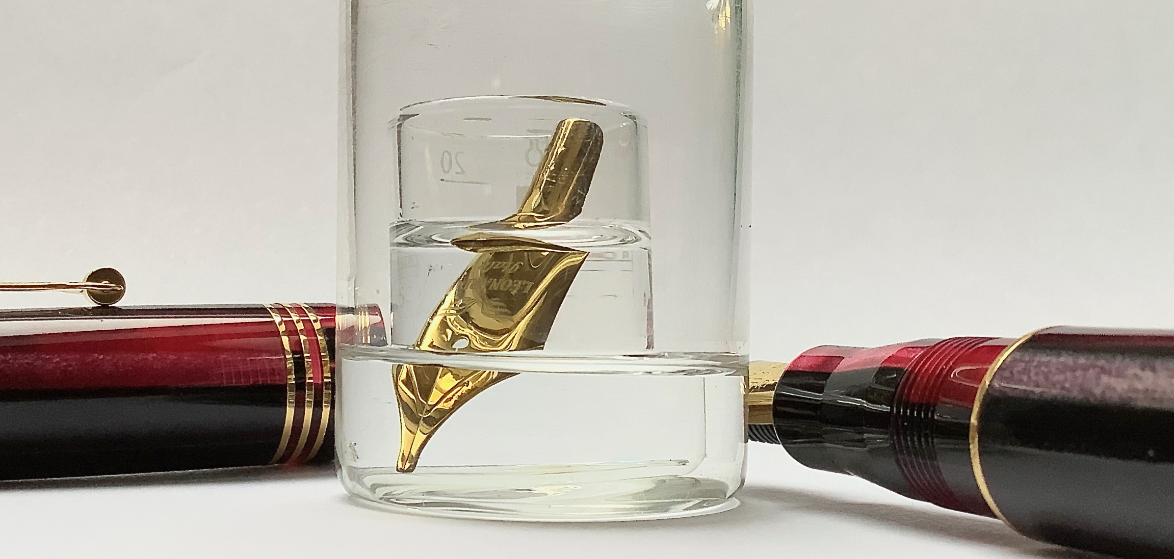 Ho usato candeggina diluita; precisamente 1 parte di candeggina e 3 parti d'acqua. Non lo consiglierei a nessuno. Per quanto riguarda i metalli, con la Sheaffer cinese non avevo nulla da perdere perchè il pennino era ormai consumato. L'avevo usata molto prima all'Università e poi nei primi anni della professione medica. Il suo lavoro l'aveva ormai pienamente svolto e ne ero consapevole.