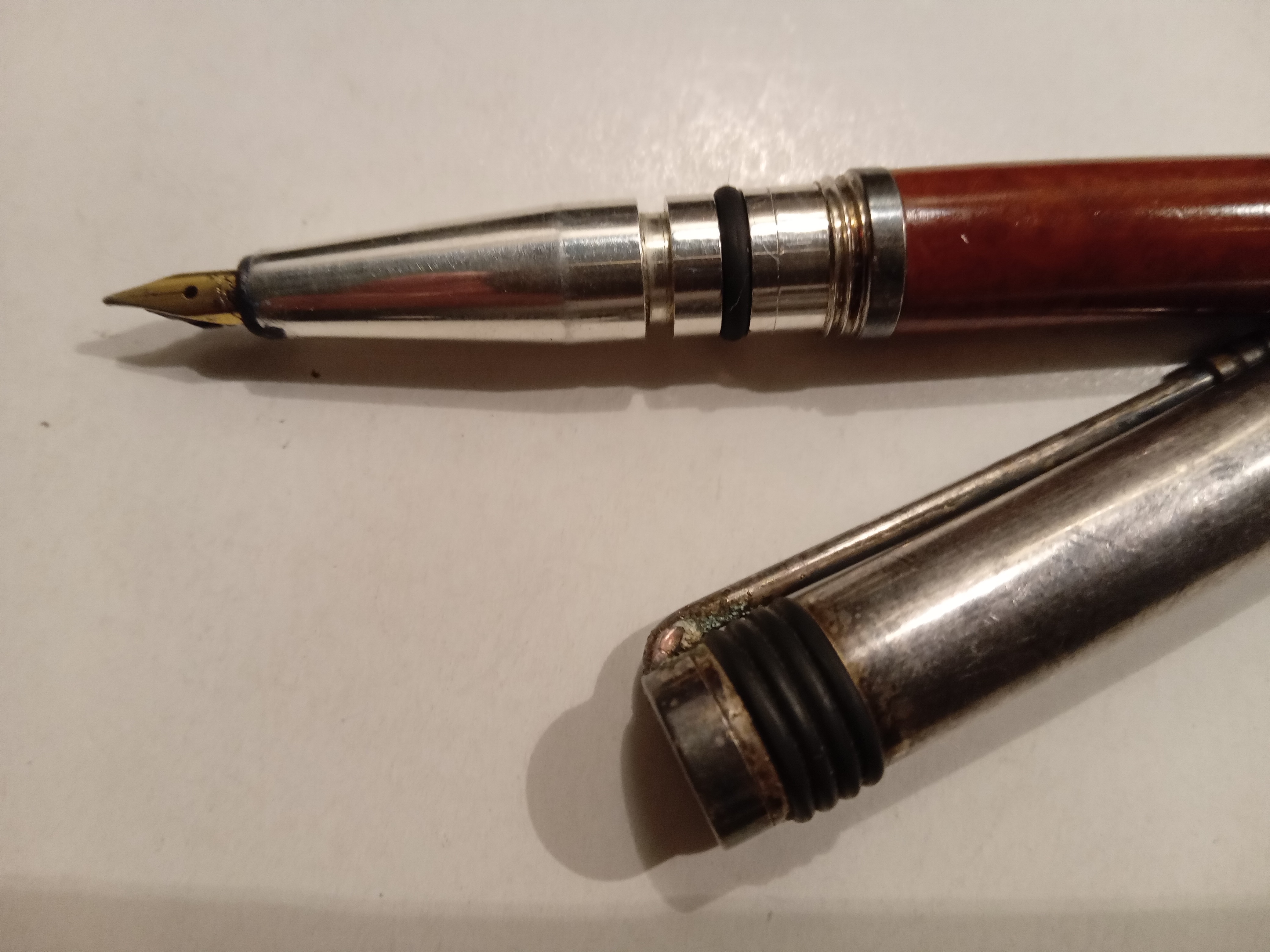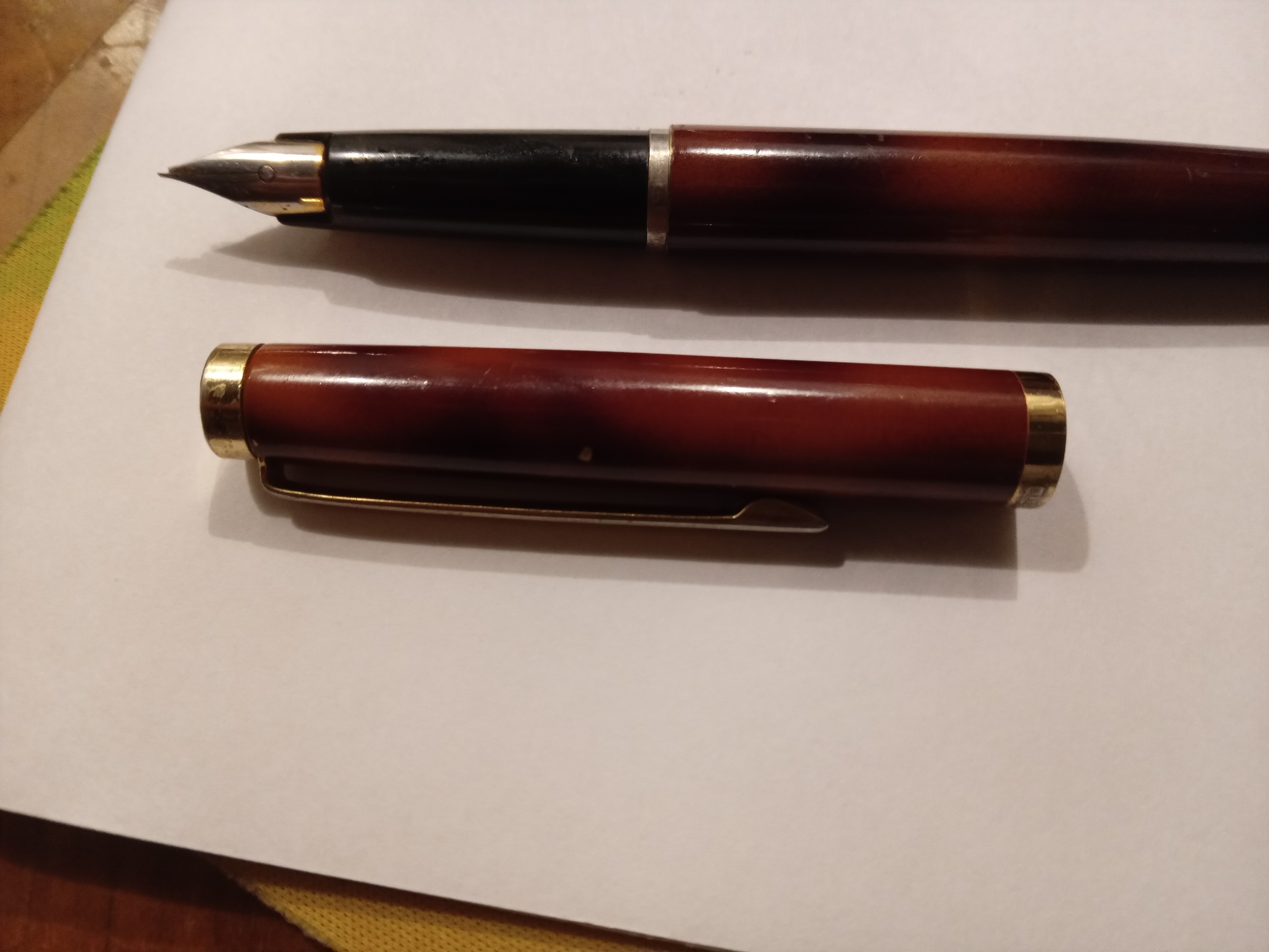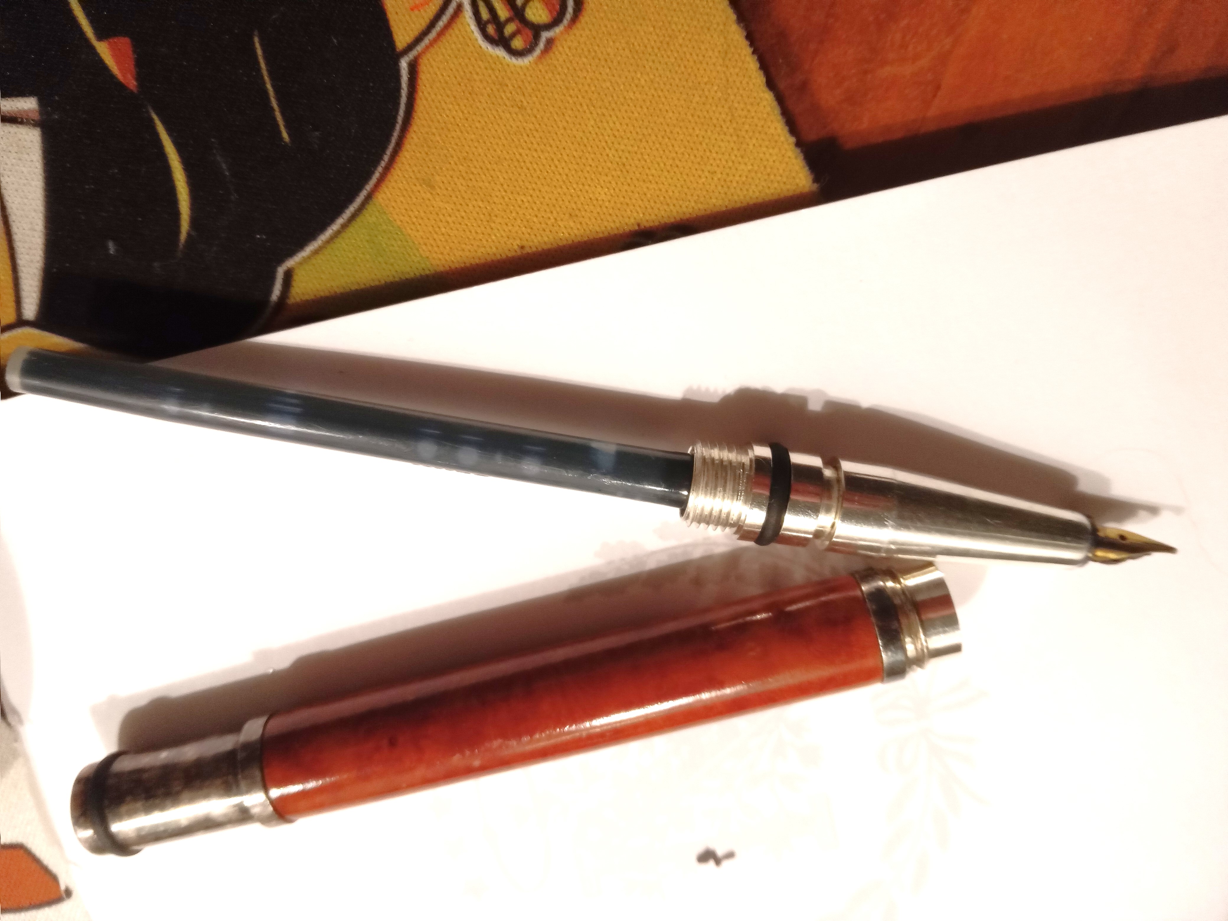 La prima (marrone) la regalarono a me tantissimi anni fa e l'ho usata tanto. Poi l'ho un po' abbandonata e non ricordo nè marca nè modello. Mi sembra di leggere la parola "Maximo o Maxima" nella parte inferiore del cappuccio (ho fatto la foto). Ora purtroppo, anche se per rimetterla in funzione l'ho pulita tenendola a bagno 2 giorni e 2 notti e poi le ho fatto passare acqua corrente, inserita la cartuccia non ne vuole sapere di funzionare. Sembra proprio che l'inchiostro non scorra al suo interno fino al pennino. Cosa può essere successo?