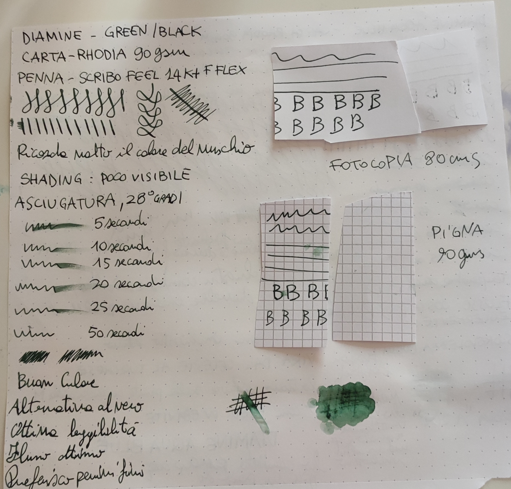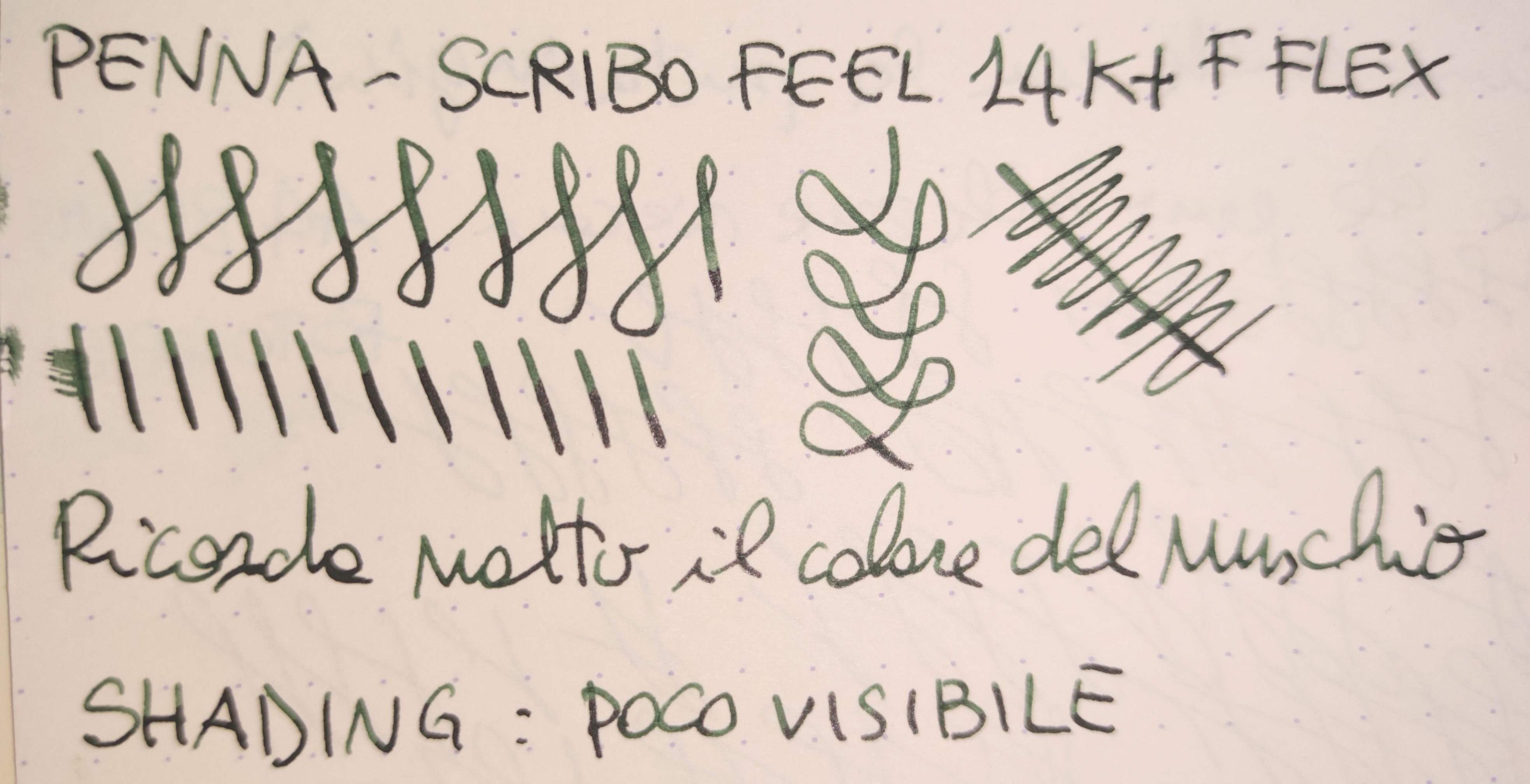 Dopo vari tentativi a distanza di tempo, ho trovato la pace dei sensi miscelando 3 parti di Noodler’s Eel Gruene Cactus con 1 parte di X-Feather Black. Ora il colore è un verdone molto scuro e la formulazione Eel garantisce la presenza di lubrificante