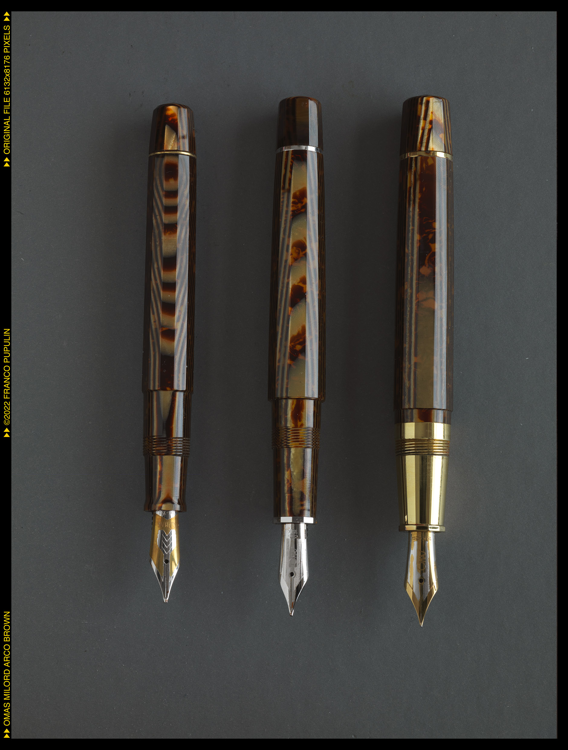 Per le sue caratteristiche intrinseche, la celluloide Arco non permette di fare due penne esattamente uguali. La “trama“ del materiale, il disegno dei suoi molti strati, è sempre diverso e varia al variare dell’angolo con cui la barra di celluloide riceve la fresatura. I punti di luci, le superfici riflettenti di bronzo, le macchie dorate, sono diversi in ogni penna. Inevitabilmente, vi sono patterns più riusciti e brillanti, altri più opachi, disegni più marcati e altri più sottili. Ciò contribuisce alla “dipendenza da Arco“, una frenetica ricerca del disegno e della trama perfetti. Le stelle si sono allineate alla nascita della mia Milord, che ai miei occhi è straordinaria e quasi tanto perfetta come si possa desiderare.