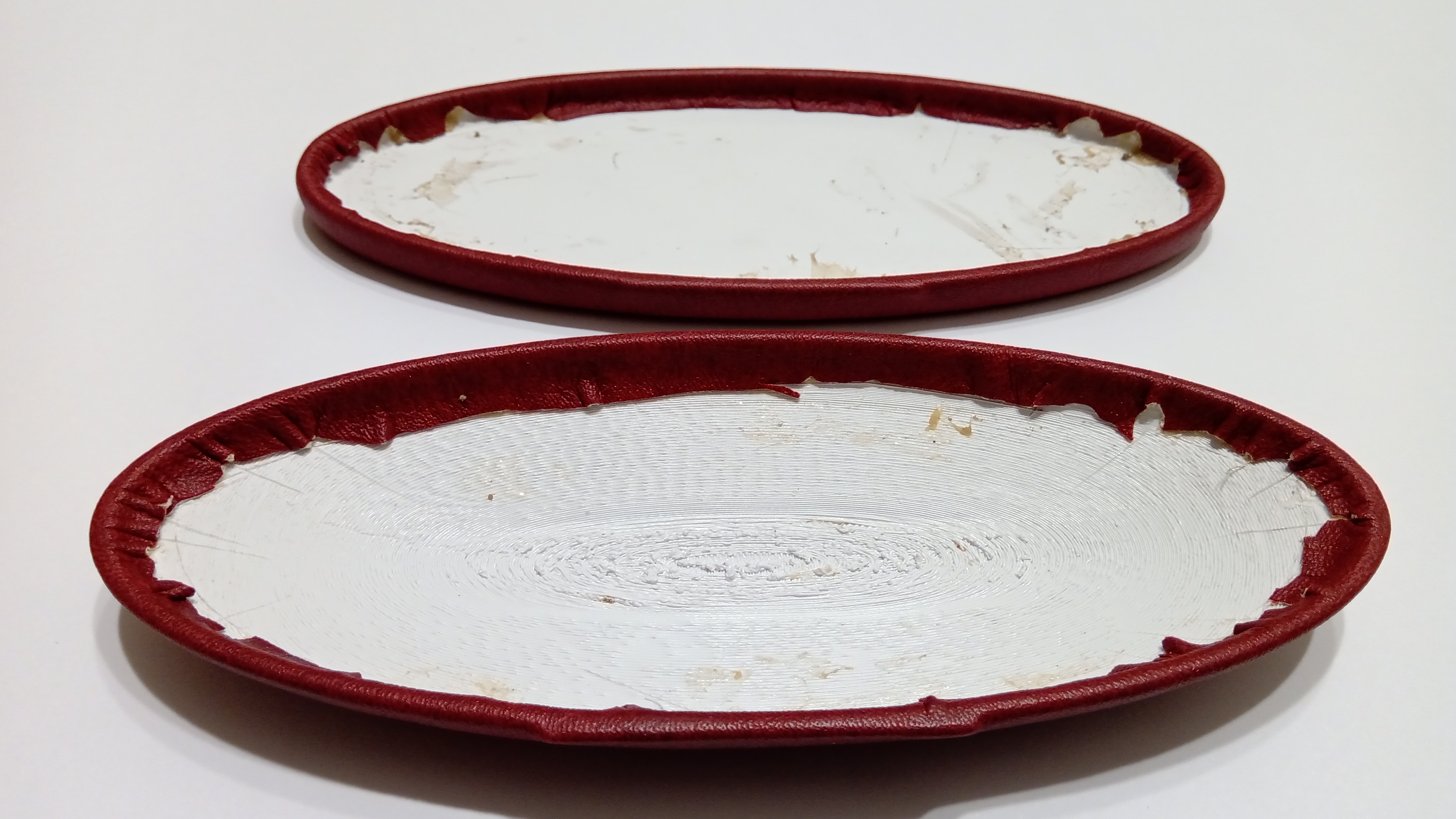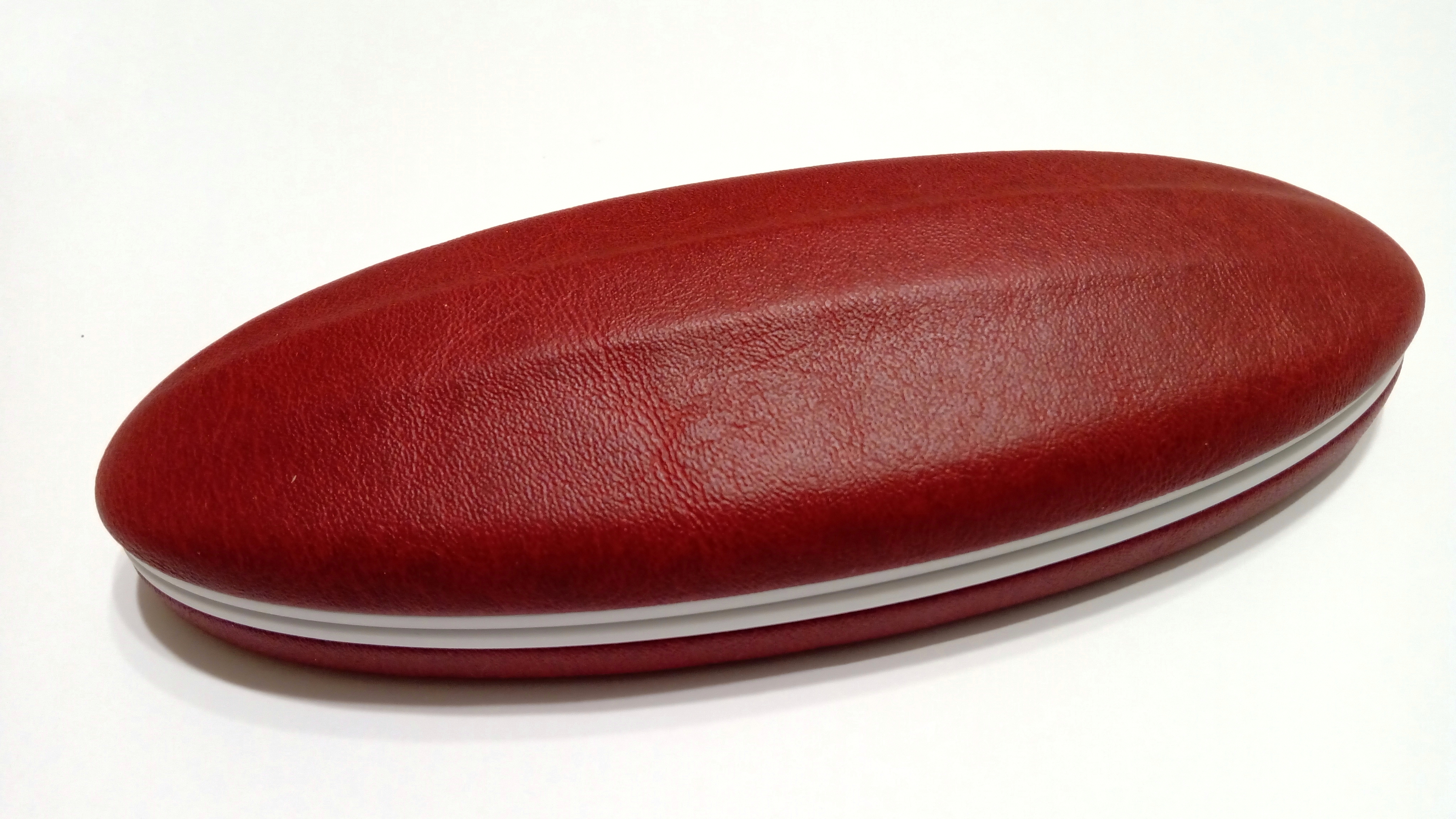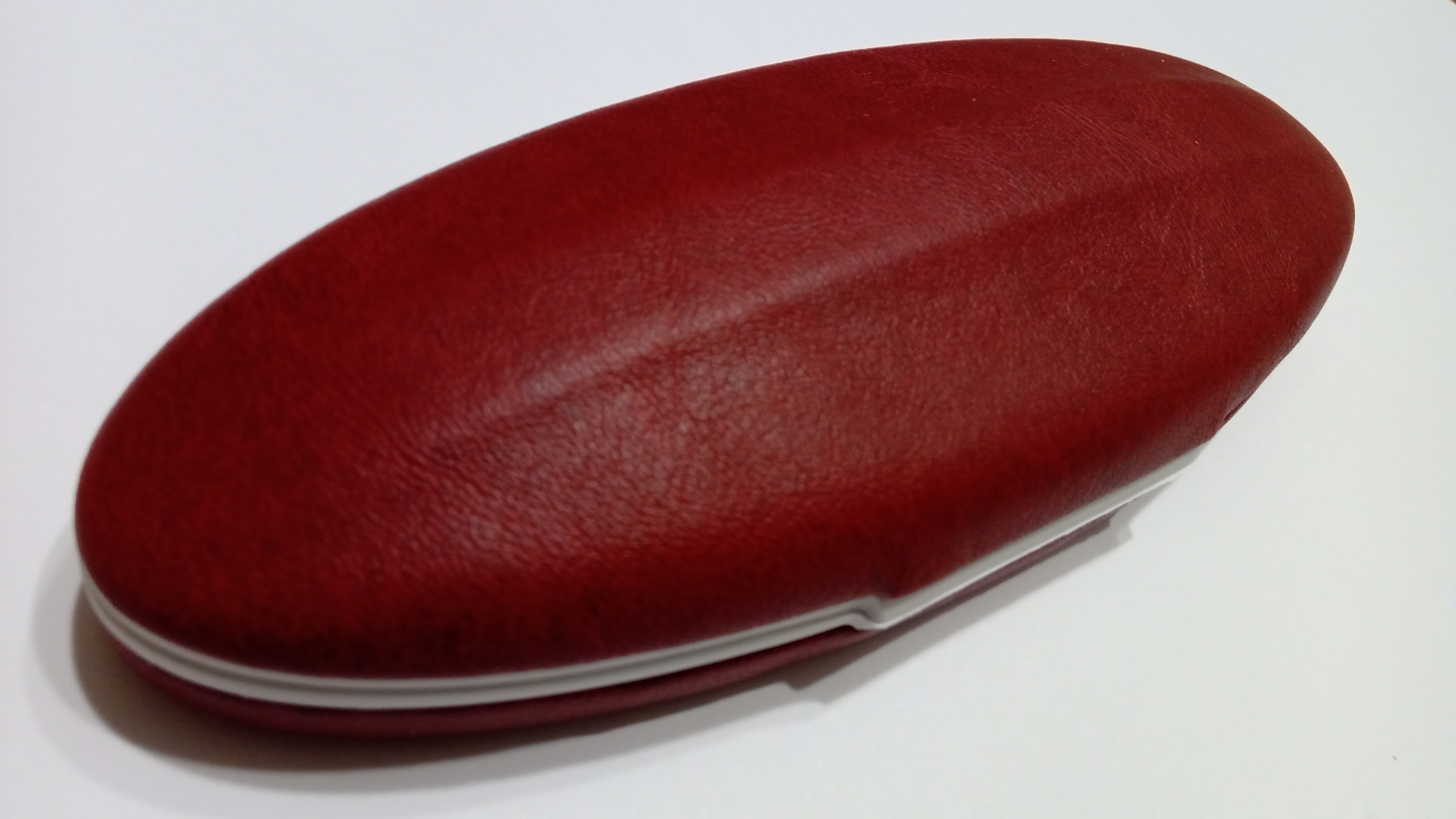 e poi incollare la similpelle rossa con cemento di contatto a base di toluene, sia sul coperchio che sulla base, distendendola per evitare la formazione di grinze...