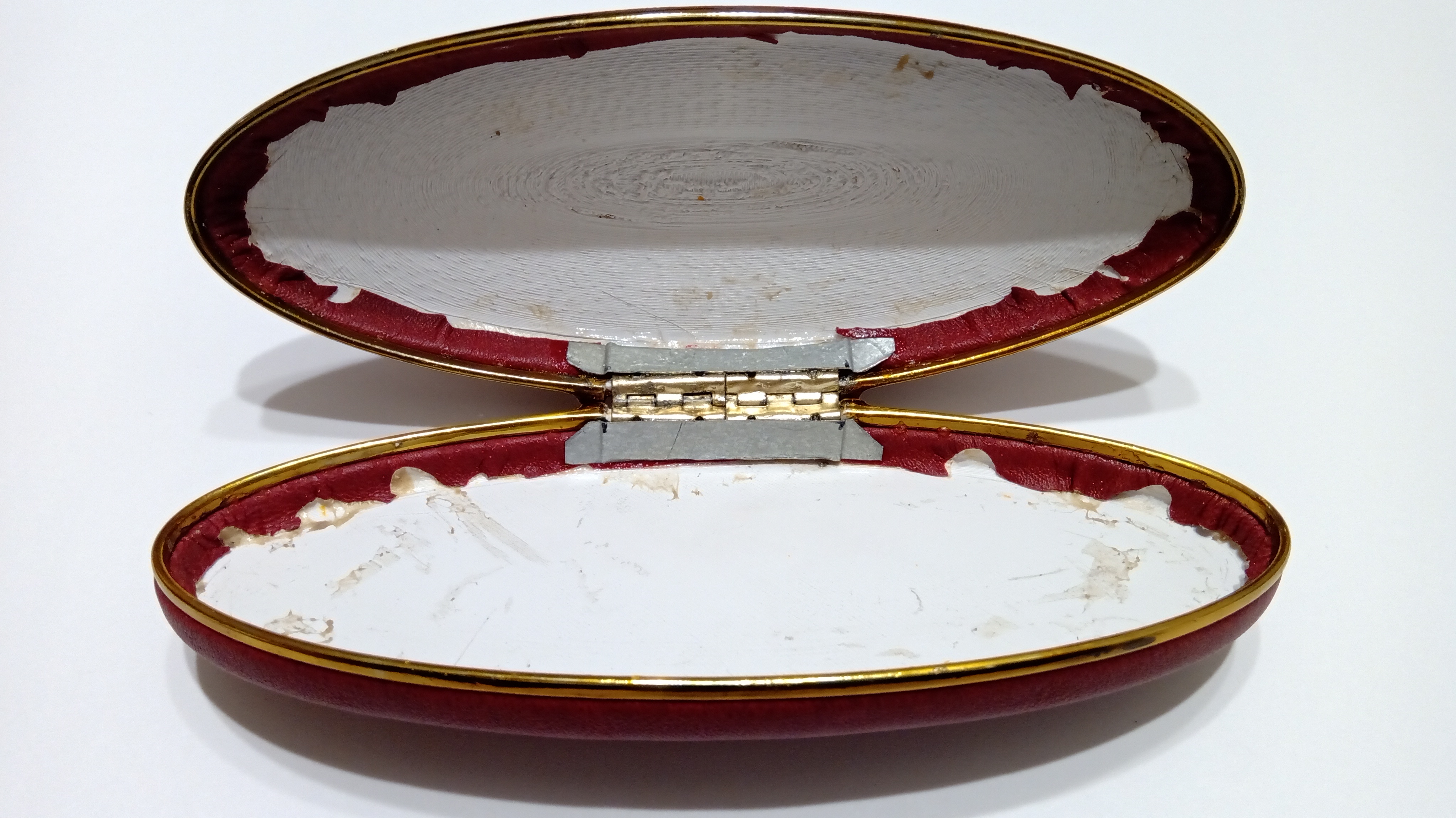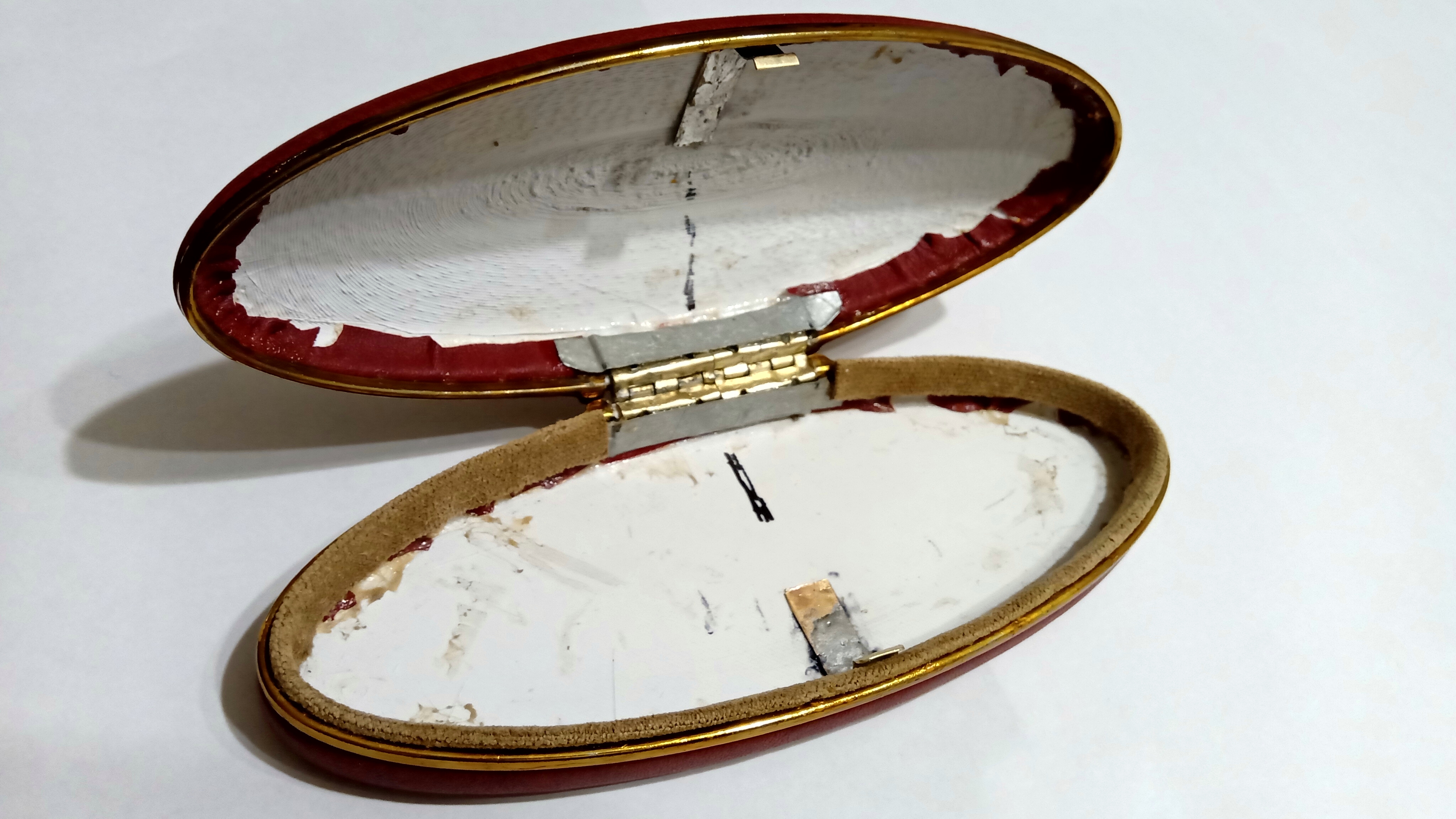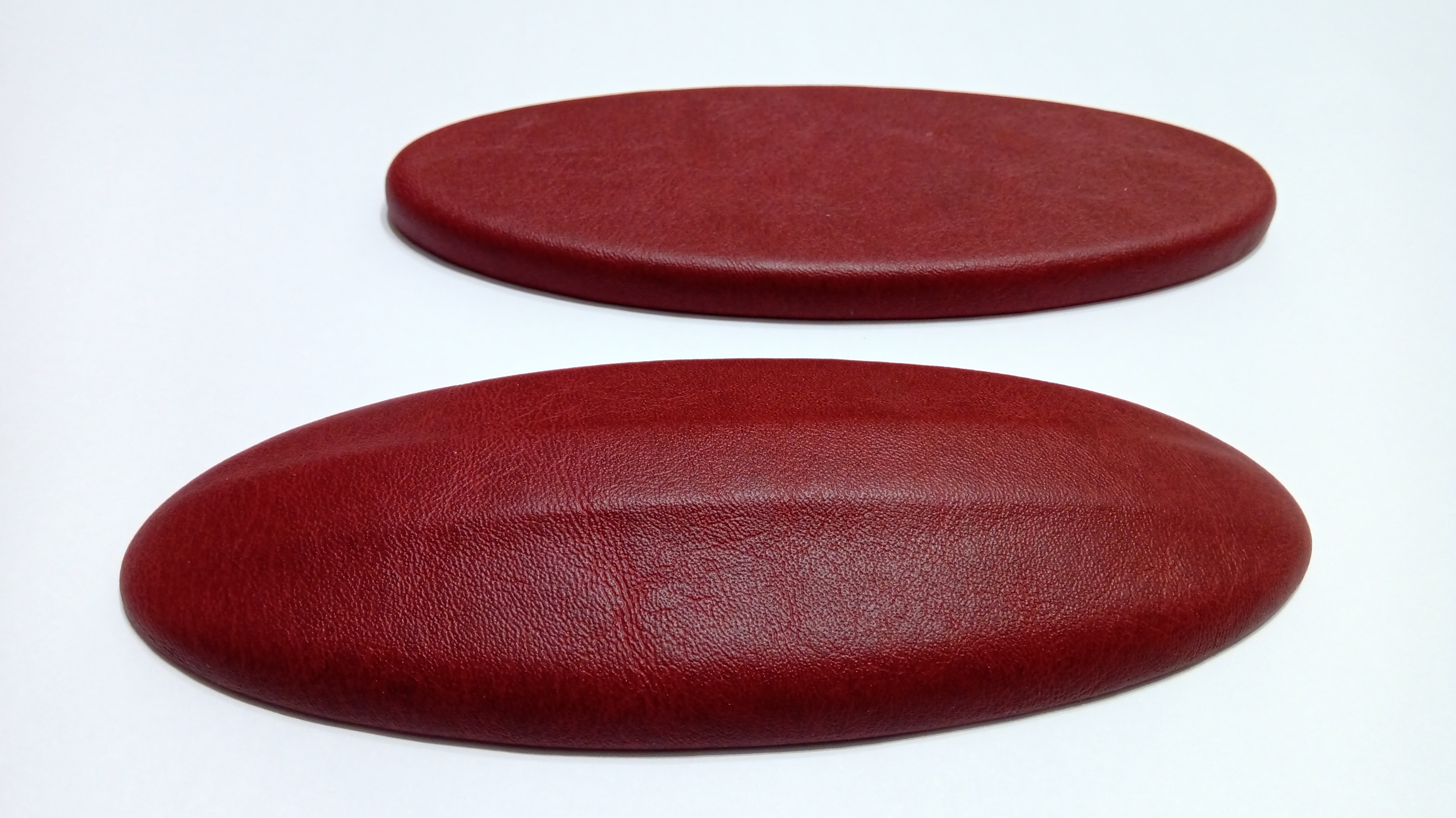 e poi incollare la similpelle rossa con cemento di contatto a base di toluene, sia sul coperchio che sulla base, distendendola per evitare la formazione di grinze...