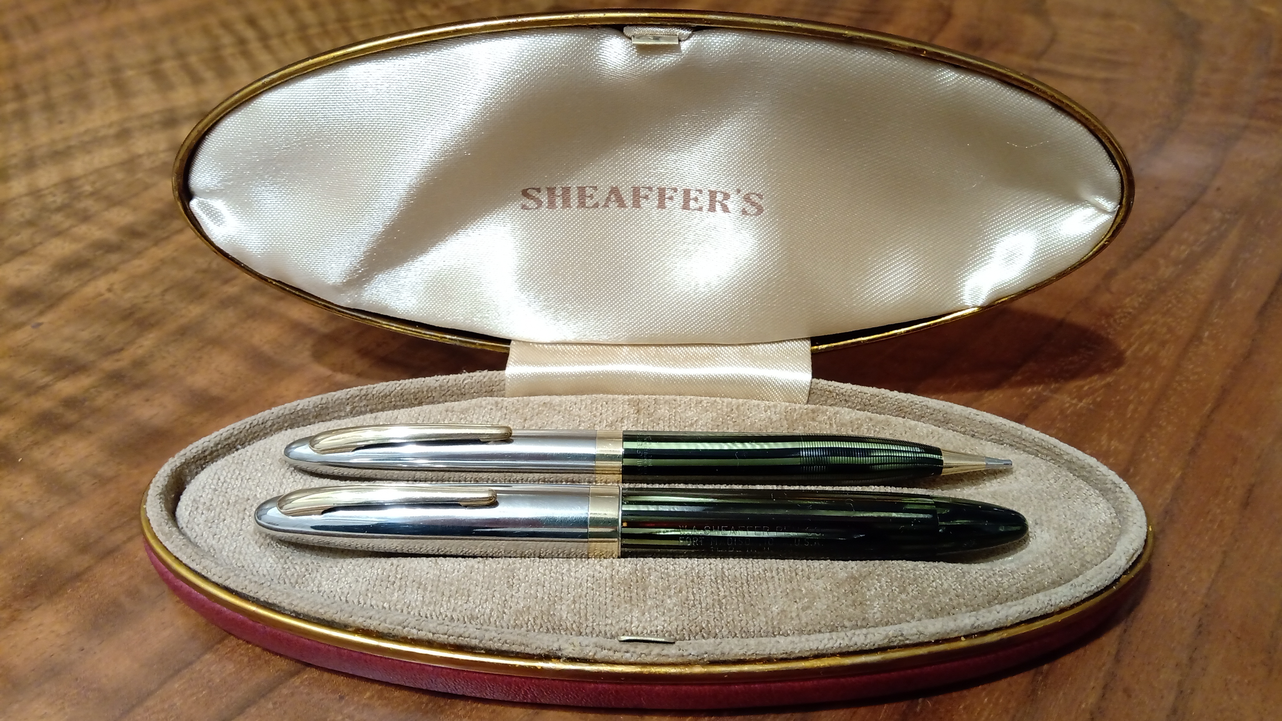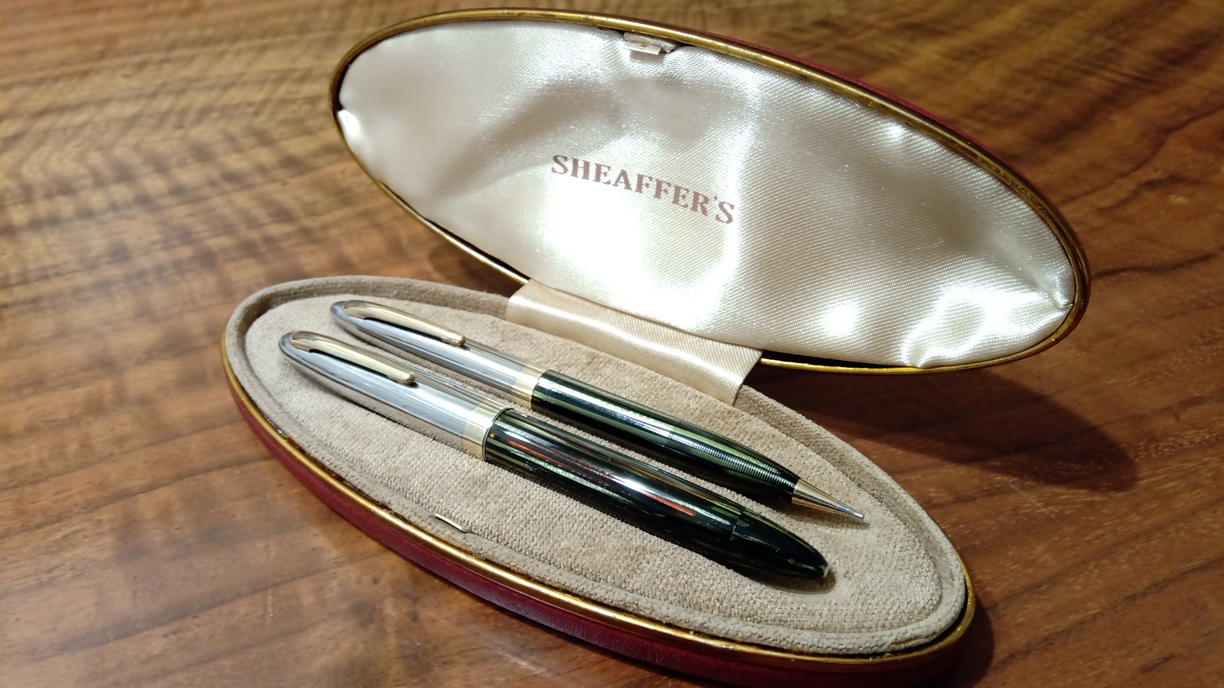 Oggi volevo lasciarvi un lavoro che vi dovevo, riguardante questo restauro che ho presentato qualche mese fa ( viewtopic.php?t=27833 ), e si trattava di questo bellissimo set di Sheaffer's Sentinel degli anni '40, prima generazione del sistema di ricarica Vacuum Filling, con pennino conico Lifetime bicolore.
