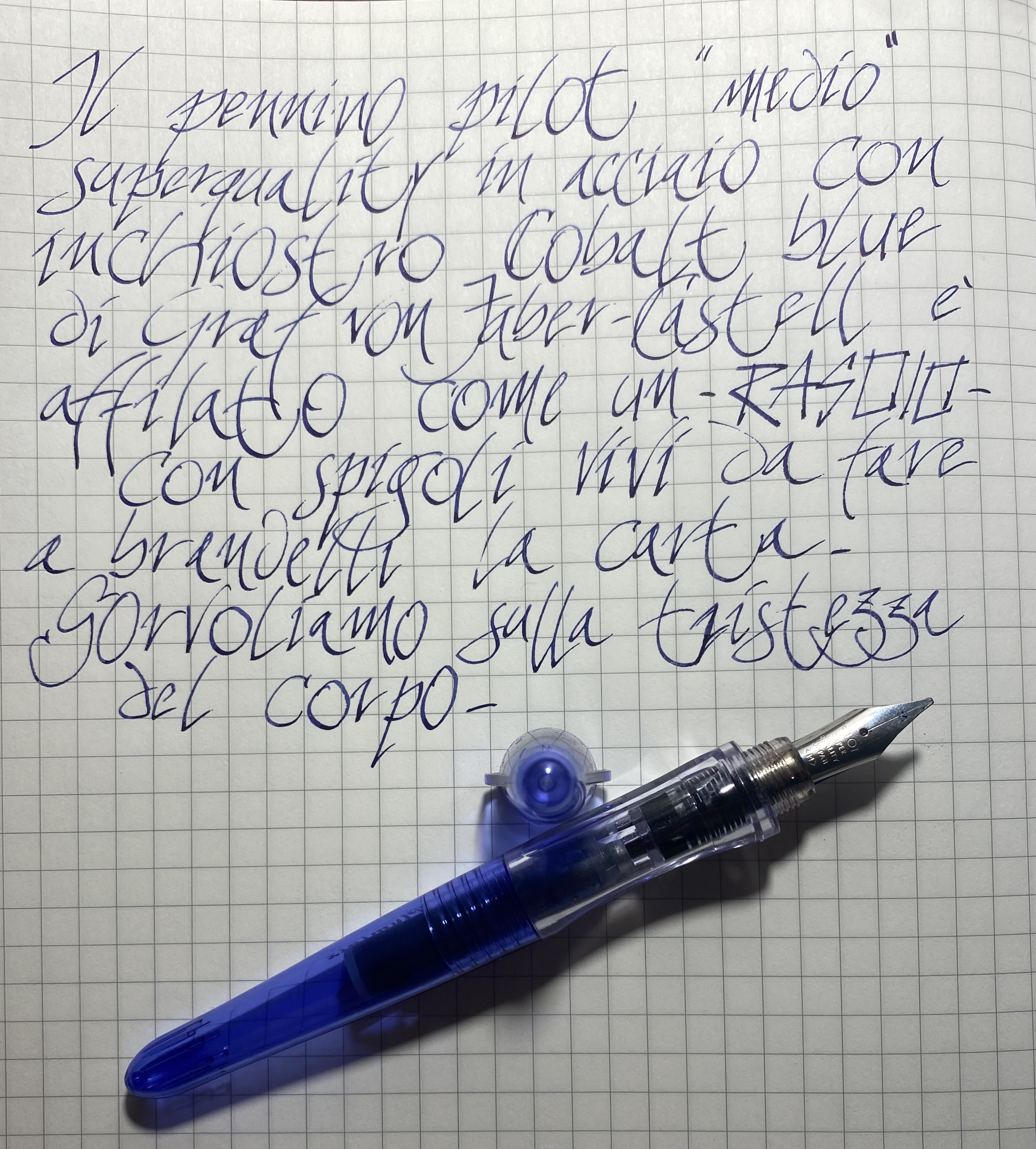 Combinazione fatta scientemente, proprio perché oggi mi annoiavo e già che cercavo di trapiantare quel pennino altrove mi sono ‘spassato’ a creare un rasoio…balthazar ha scritto: ↑sabato 4 novembre 2023, 19:41A prescindere da quello che c'è scritto sopra quei pennini, sono degli italici a tutti gli effetti. Della stessa serie presi un "B" con una Plumix - e se parliamo di tristezza, questa - la mia è pure nera - ne esprime molta - che ho trapiantato su di una 78G. E' certamente un pennino tagliato, ma i suoi spigoli non sono così netti da fendere la carta, anzi scrive con una certa morbidezza; insomma, a mio parere, è un pennino molto godibile. Infine, rilevo la stessa fattura su altro "B" Pilot tratto da altra 78G, questo marcato "superquality" che scrive con una fluidità ancora maggiore del precedente. Intatta la piacevolezza d'uso. Mi spiace che la tua esperienza con questi "pezzetti di ferro" sia stata spiacevole ma ti consiglierei di cambiare inchiostro, in quanto quel GVFC a me pare molto secco. Ora lo sto usando in cartucce sulla mia Sport Brass e come risultato ho che un pennino solitamente ben scorrevole ora quasi arranca sulla carta (non che questo mi dispiaccia, anzi, mi piace un certo freno che mi aiuta a meglio controllare la penna) ed immagino l'effetto che questo può avere se usato con un pennino "tagliente".