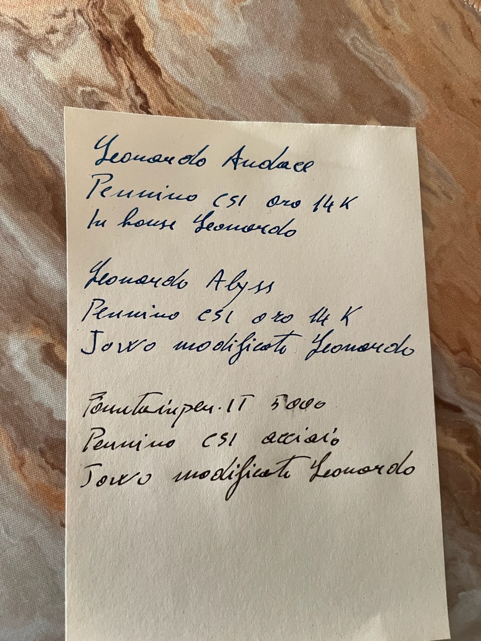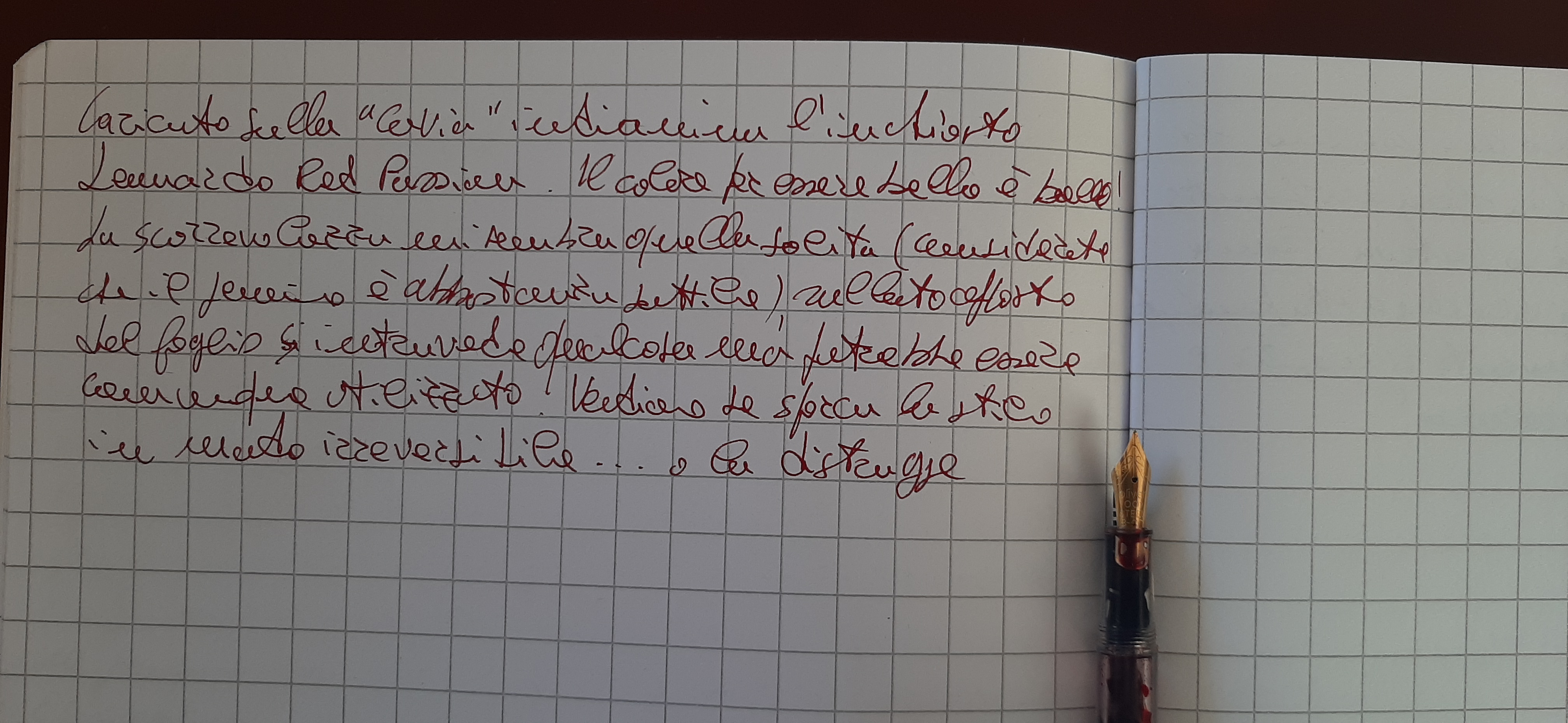 E' arrivata ...con il pennino CSI devo "trovare la mano", mi sembra gradisca posizioni vincolate e tocco leggero ... in confezione anche una boccetta di inchiostro Leonardo red passion ...in internet ho trovato recensione assai poco lusinghiera ( acido simil ferrogallico e sporca le penne) ma voglio caricarlo su di una 'indianina" e provarlo ...qualcuno lo ha utilizzato e puo' dire qualcosa ? Voglio ringraziare il gentile utente che me l'ha ceduta, veramente persona piacevole e corretta, devo dire che i miei contatti avuti sul Forum sono sempre stati positivi e voglio sperare che rimanga una piccola oasi ...