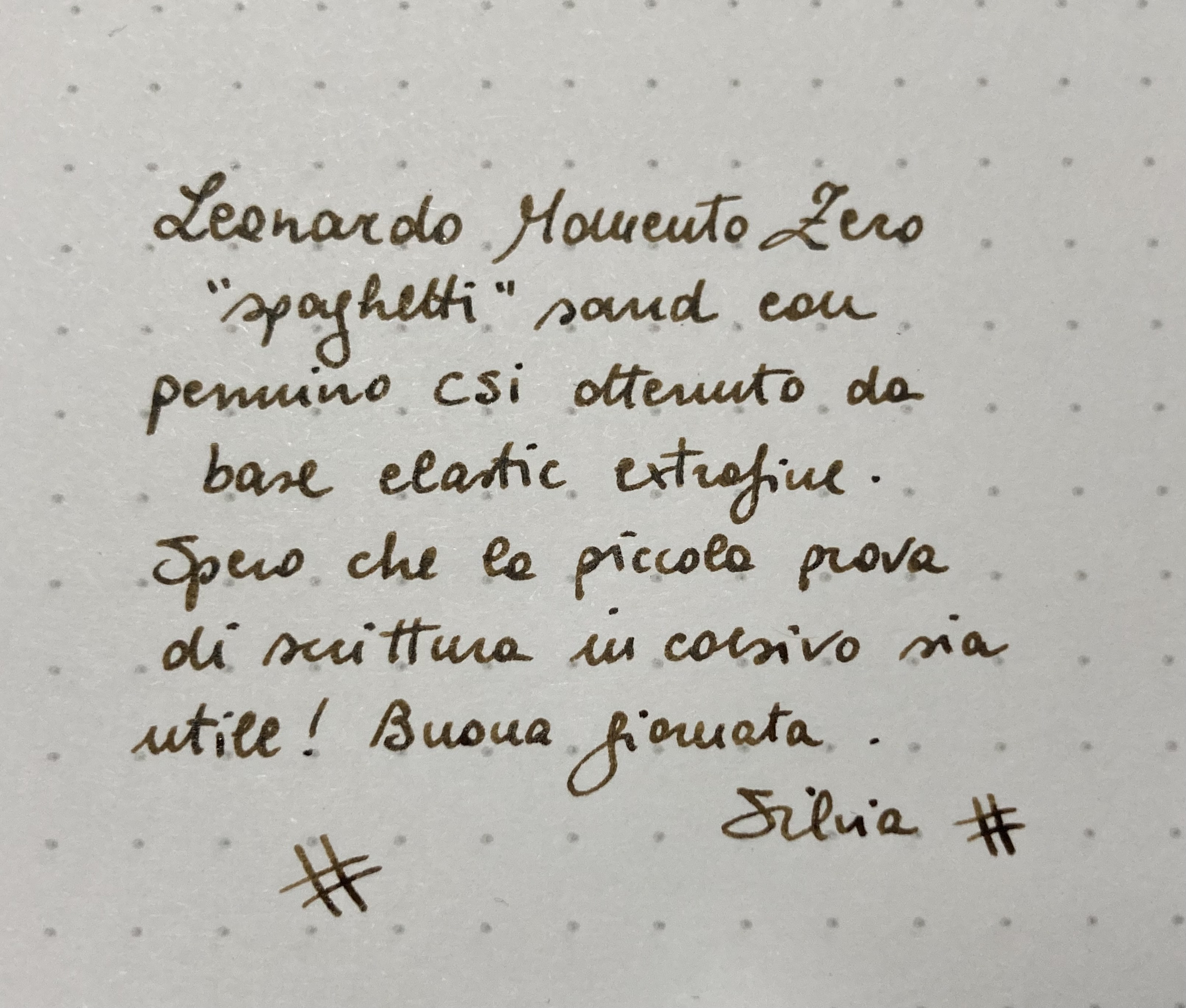 L'utilizzo della Leonardo Rubino e' piacevole, magari il prnnino ( CSI misura M) e' un po' " sibilante" ( cosa che personalmente non apprezzo particolarmente), ma non noto grandi differenze di tratto,, con lo Stub mi sembrano decisamente piu' marcate e che la grafia acquisti maggior carattere. Probabilmente non sono in grado di utilizzarlo correttamente; appena ho modo inserisco una prova di scrittura ...
