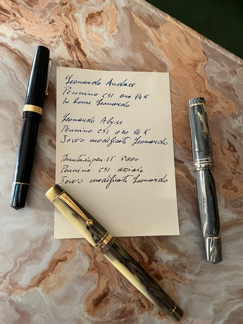Le prime sue usano inchiostro Leonardo blu abbastanza fluido, la terza un Diamine Macassar asciutto
