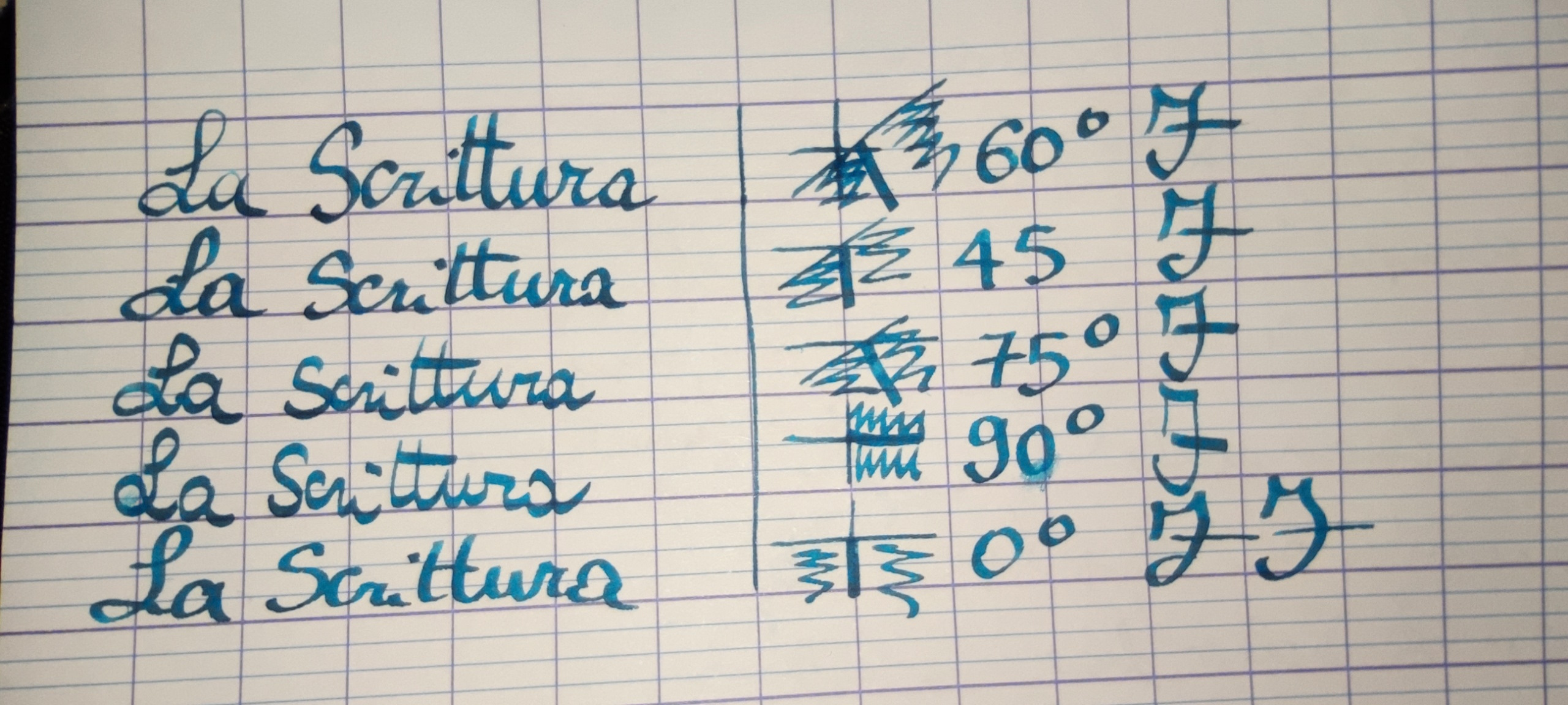 Questo è la mia prova con i vari angoli , tenendo la penna inclinata a circa 45° dal foglio dritto