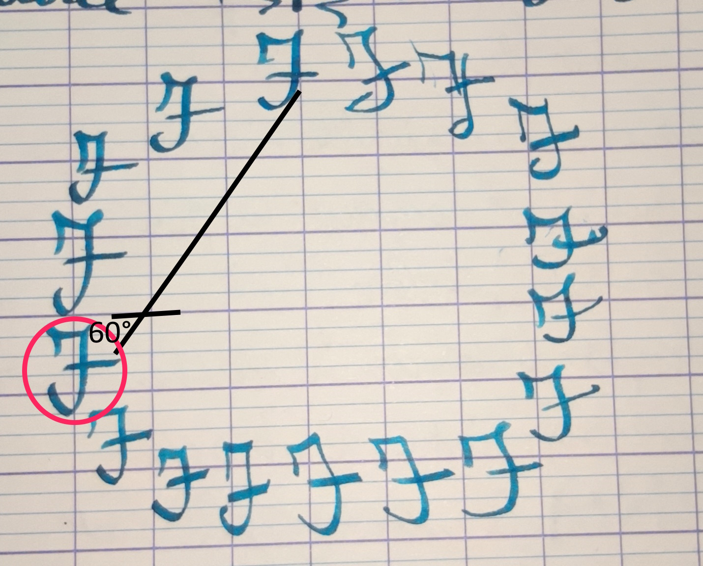 Provando con varie rotazioni del pennino prendendo come riferimento la F delle ore 12 come punto iniziale a 0° di inclinazione.