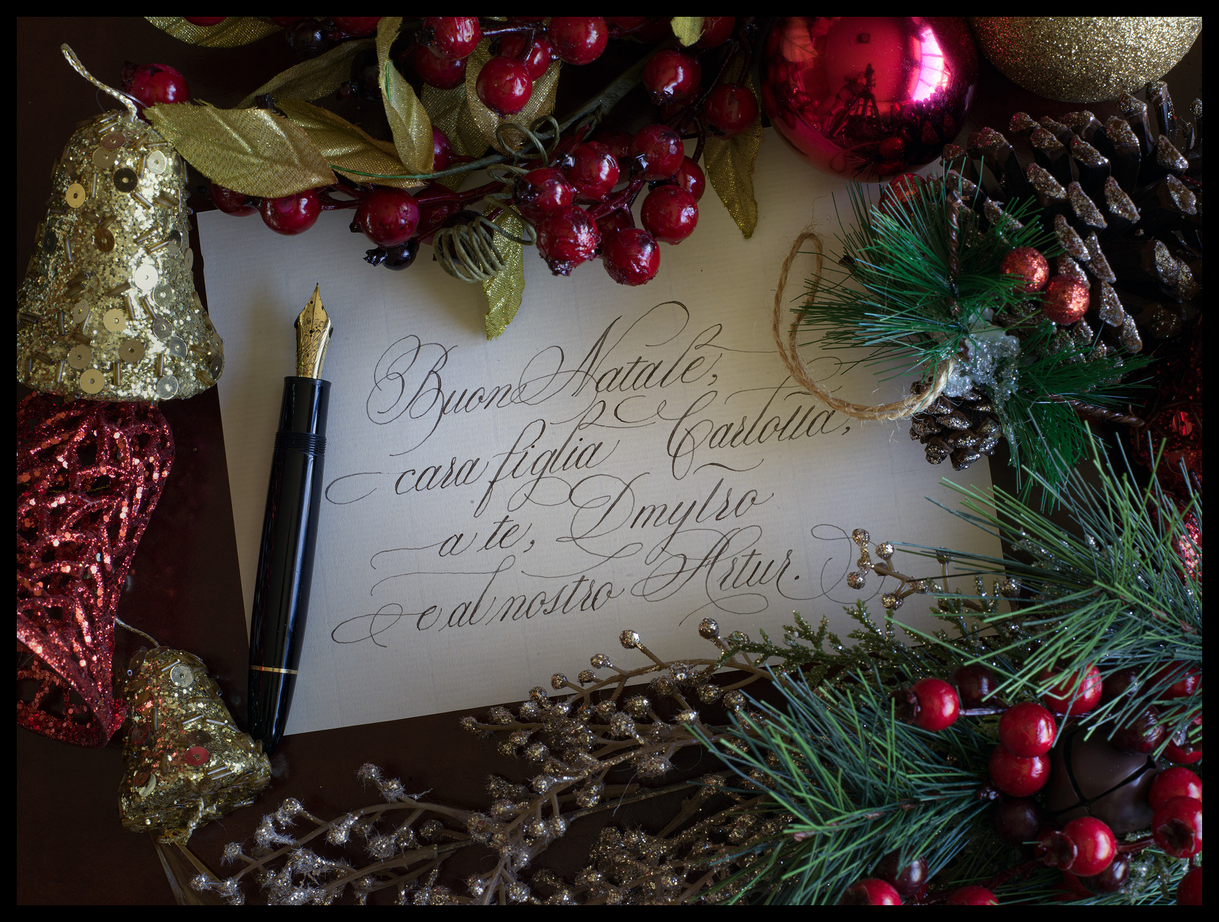 Si colloca il set vicino a una finestra, in modo che abbia luce laterale (che ne accentua il rilievo) e vi si posiziona il primo dei biglietti con la sua penna, Non é necessario che sia quella con la quale si é scritto il testo: la maggior parte dei destinatari non sapranno nulla di penne stilografiche e questo ci permette di giocare con forme e colori delle nostre stilografiche. Si scatta quale foto, variando l’esposizione (questo si può fare anche con la fotocamera del telefono), per scegliere infine quella che ci é parsa migliore. Per esperienza, so che una fotografia un po’ sottoesposta fa più “notte di Natale”…