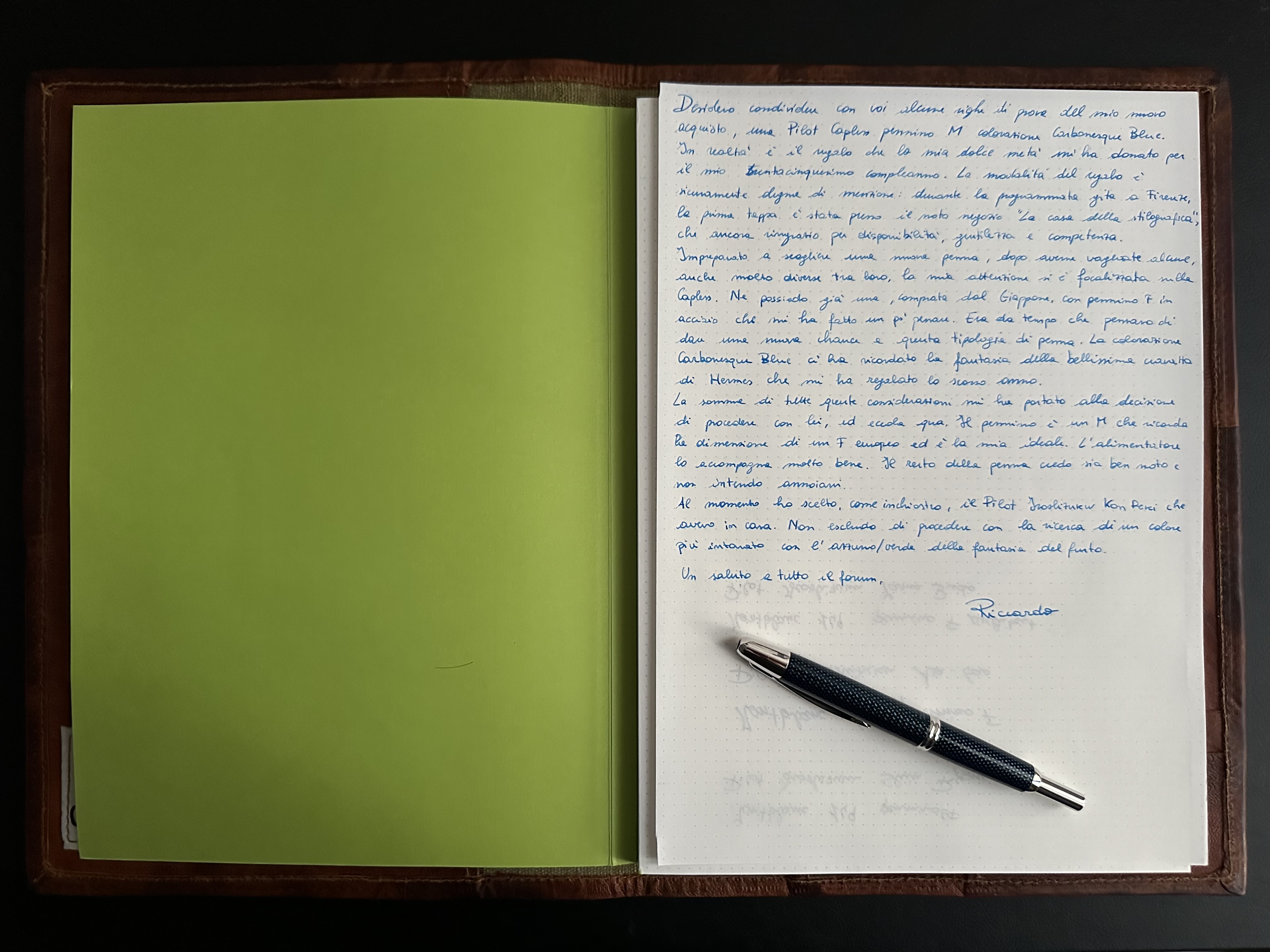 Io pure ho la gialla, con pennino stub. È davvero una penna favolosa. La amo nella colorazione gialla e trovo il pennino stub eccellente: bagnato, morbido, bella variazione di tratto. Per come tengo la penna, io la trovo comoda e la clip non mi dà fastidio.henryicd ha scritto: ↑mercoledì 13 dicembre 2023, 11:00 Bellissima recensione. Penna favolosa. Io da pochi mesi ho la versione in giallo con pennino fine e mi trovo benissimo e sono pienamente soddisfatto. Non mi convinceva e tutt'ora non mi convince la clip. Ma la qualità generale e di scrittura mi fa superare ogni titubanza.