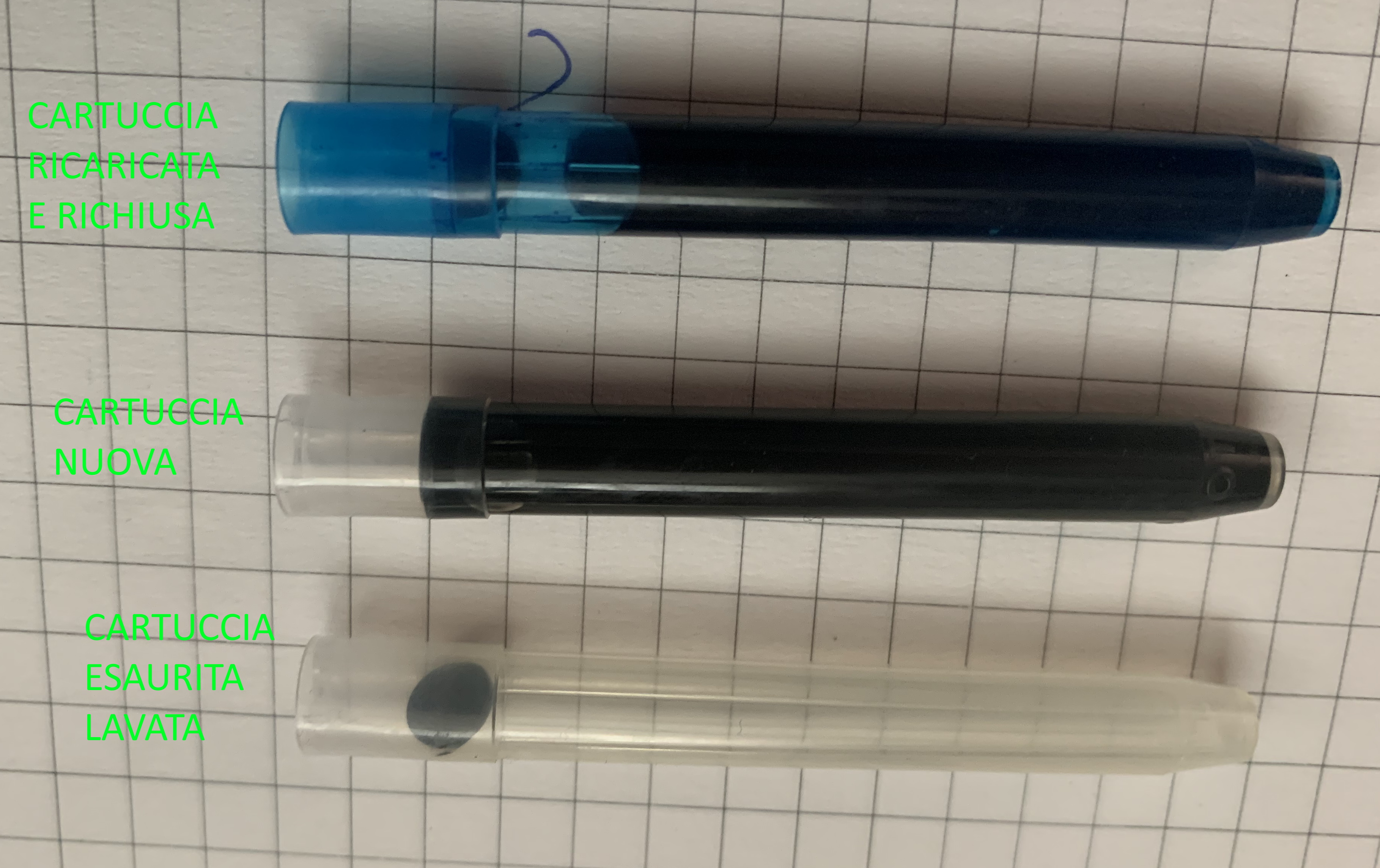 Per prima cosa, quando avete esaurito la vostra cartuccia, staccatela dalla penna e datele una sciacquata e lasciatela asciugare se volete cambiare inchiostro, altrimenti se la volete ricaricare con lo stesso potete tenerla così com'è.