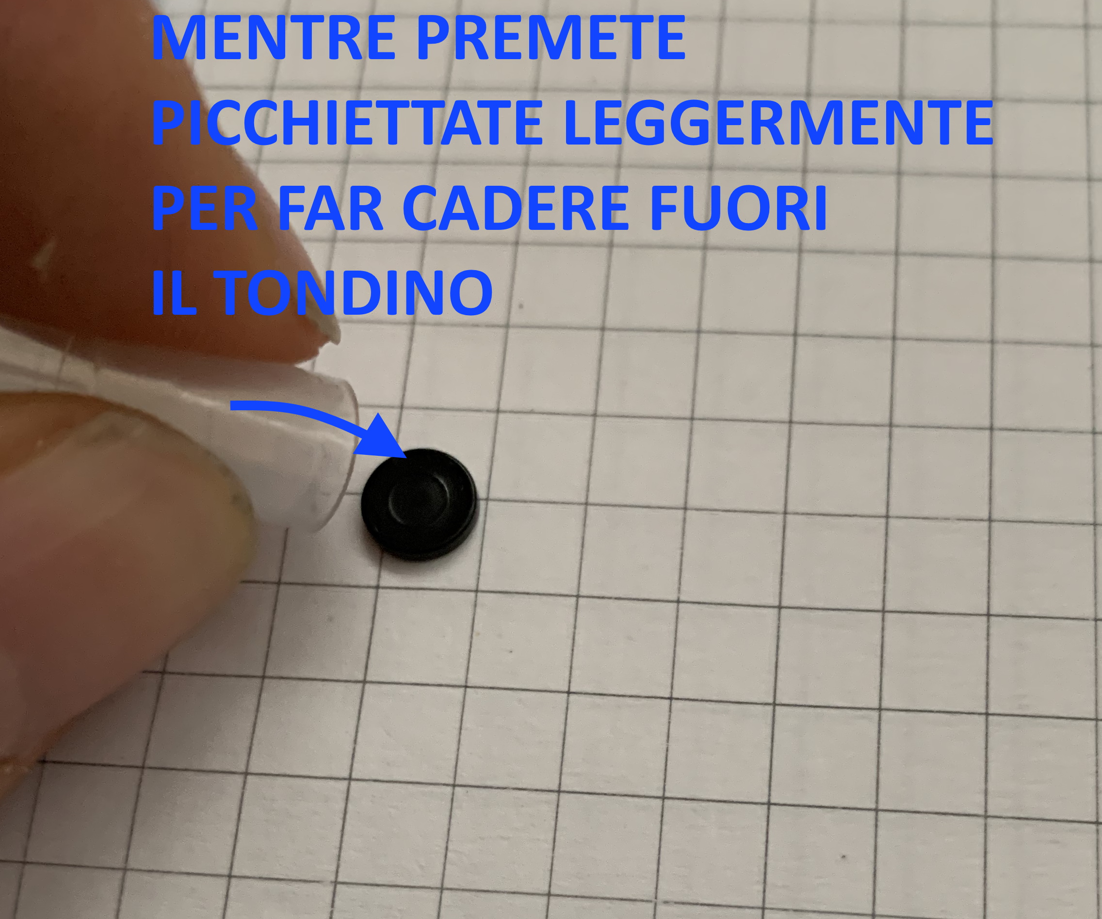 3. Stringete delicatamente in modo da ovalizzare leggermente la cartuccia mentre la picchiettate su una superficie rigida in modo da far uscire il tondino. Non perdetelo!