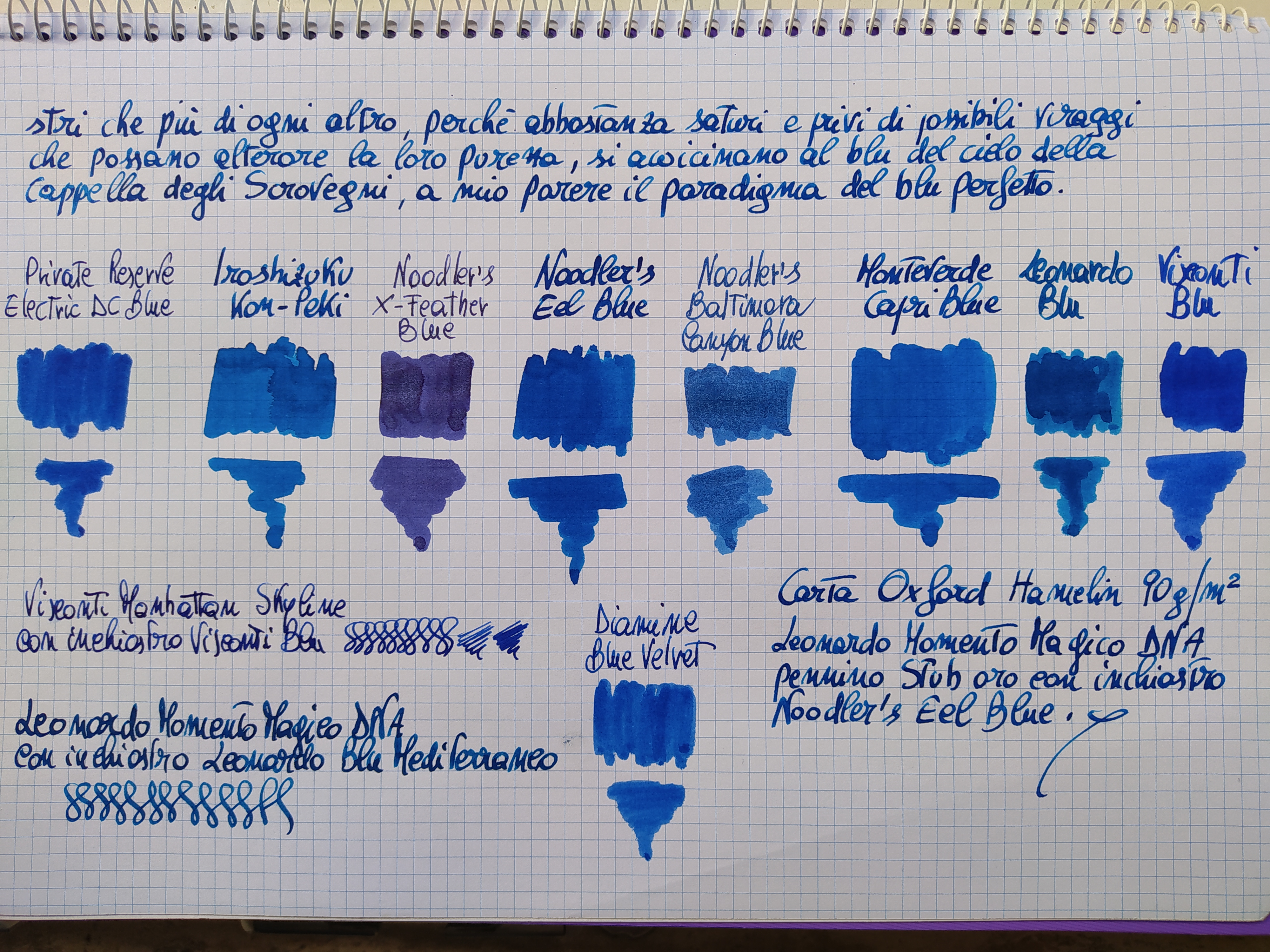 Dalle prove effettuate a mio modo di vedere quello che si avvicina di più all'azzurrite usata per la Cappella degli Scrovegni è decisamente il Private Reserve Electric DC Blue ed il Noodler's Eel Blue. Ma a questi, sebbene abbia una minima percentuale di sottotono rossastro che lo avvicinerebbe al lapislazuli o di Fra' Angelico. preferisco il Visconti Blu. Il Diamine Blue Velvet si avvicina molto, come il Leonardo Blu, ma il primo è un pò più spento ed il secondo, comunque bellissimo, è leggermente più chiaro.