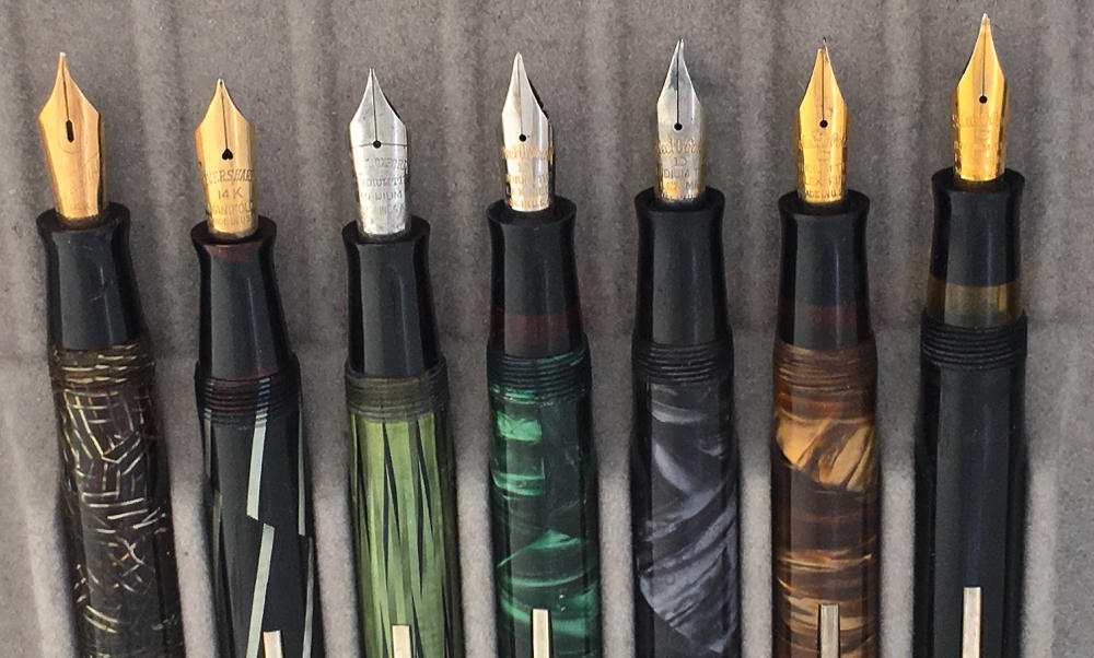 Sarà, la nostra Oxford, una produzione Wahl di secondo piano (qualcosa si risparmiò nell’innesto della clip sul cappuccio e nelle rifiniture delle estremità, non certo scolpite come quelle della meravigliosa Doric), tuttavia, come già avrete intuito più sopra, le celluloidi che si trovano in giro sono varie, alcune davvero meravigliose: la stilografica, infatti, è attestata inizialmente nei colori Jet Black, Red Metallic Pearl, Green Metallic Pearl e Grey Metallic Pearl, a cui si aggiungeranno in seguito il marrone, un verde a “buccia di anguria”, altre celluloidi a righe e con motivi a rete (modello twist filler) assai vistose.