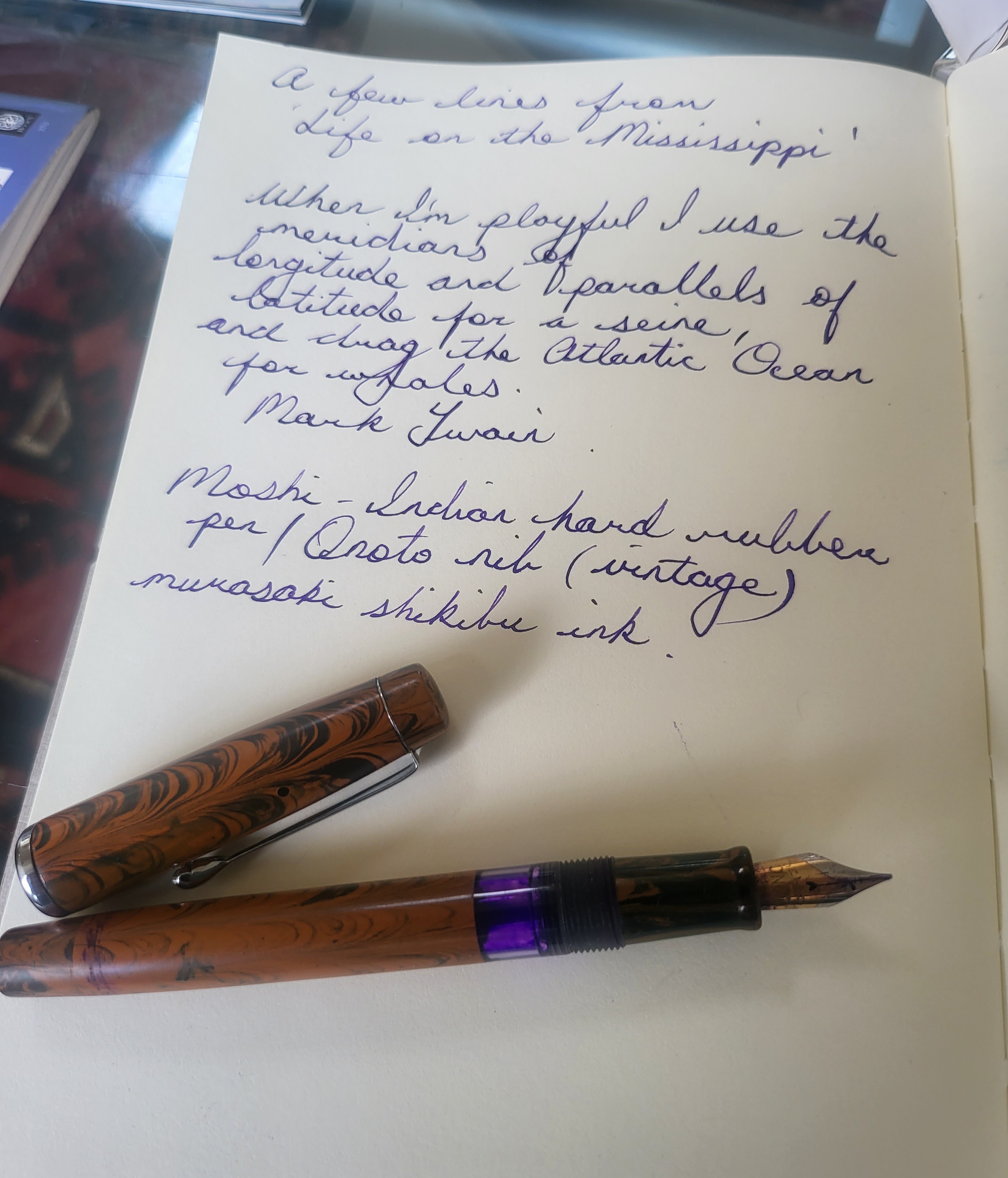 La penna che circola per adesso sulla mia scrivania, una Duofold made in England inchiostrata con lo Stipula Blu della Robbia su un quaderno Clairefontaine con le righe alla "francese"...controllando appunti.