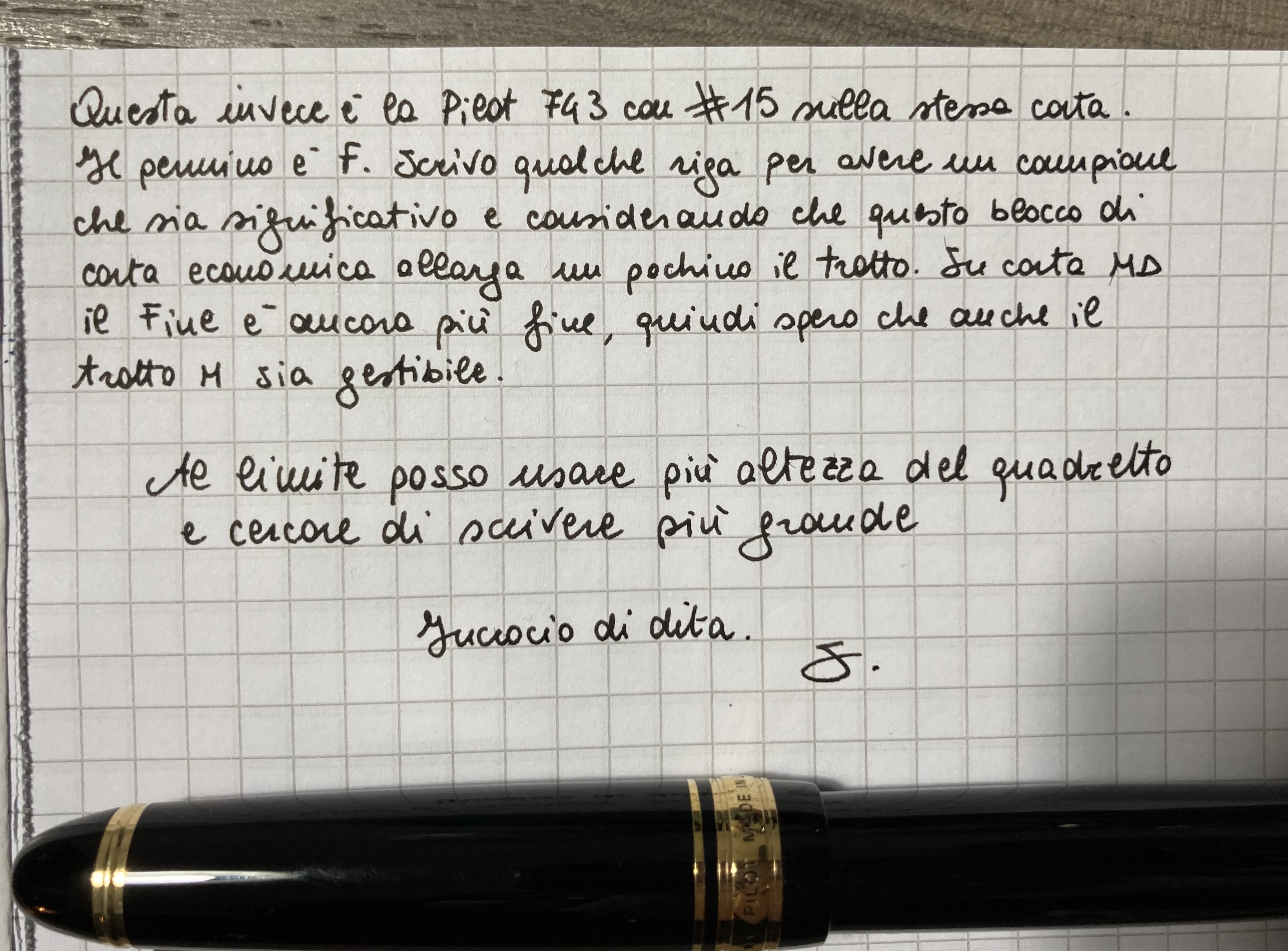 Se scrivi come hai scritto con la F ( 1/2 sulla F invece di poco più di 1/3 sulla M ) non credo che ti si chiuderanno gli occhielli , con il #5 pilot B che ho provato scrivevo bene sulle righe da 4mm dei blocchi pignaSilvia1974 ha scritto: ↑sabato 2 marzo 2024, 18:26 mi importa solo che con M non mi si chiudano gli occhielli.