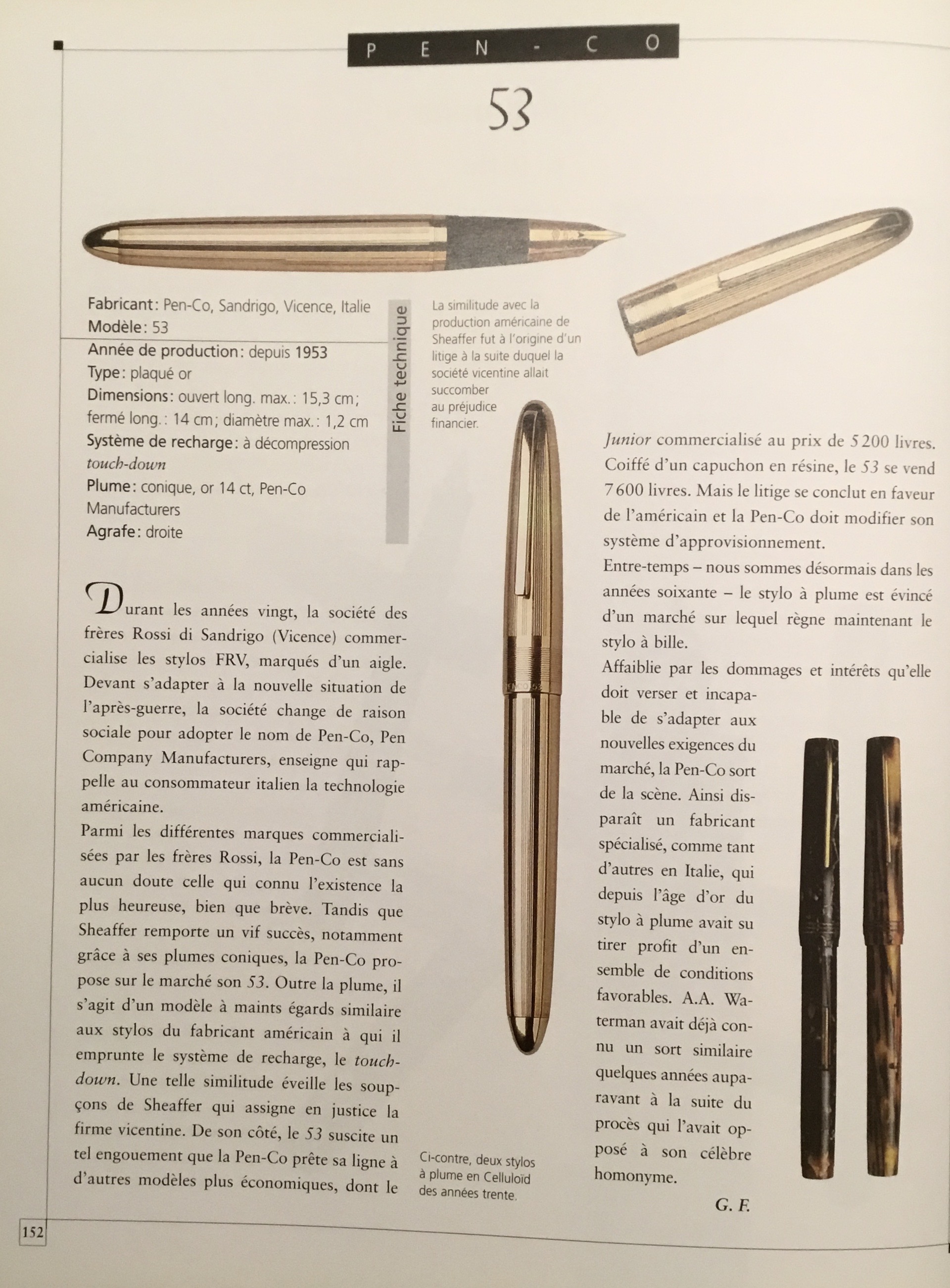 Ho trovato questa interessante pagina descrittiva su Pen Co, italianissima di Vicenza, su un libro francese dedicato alle stilografiche.