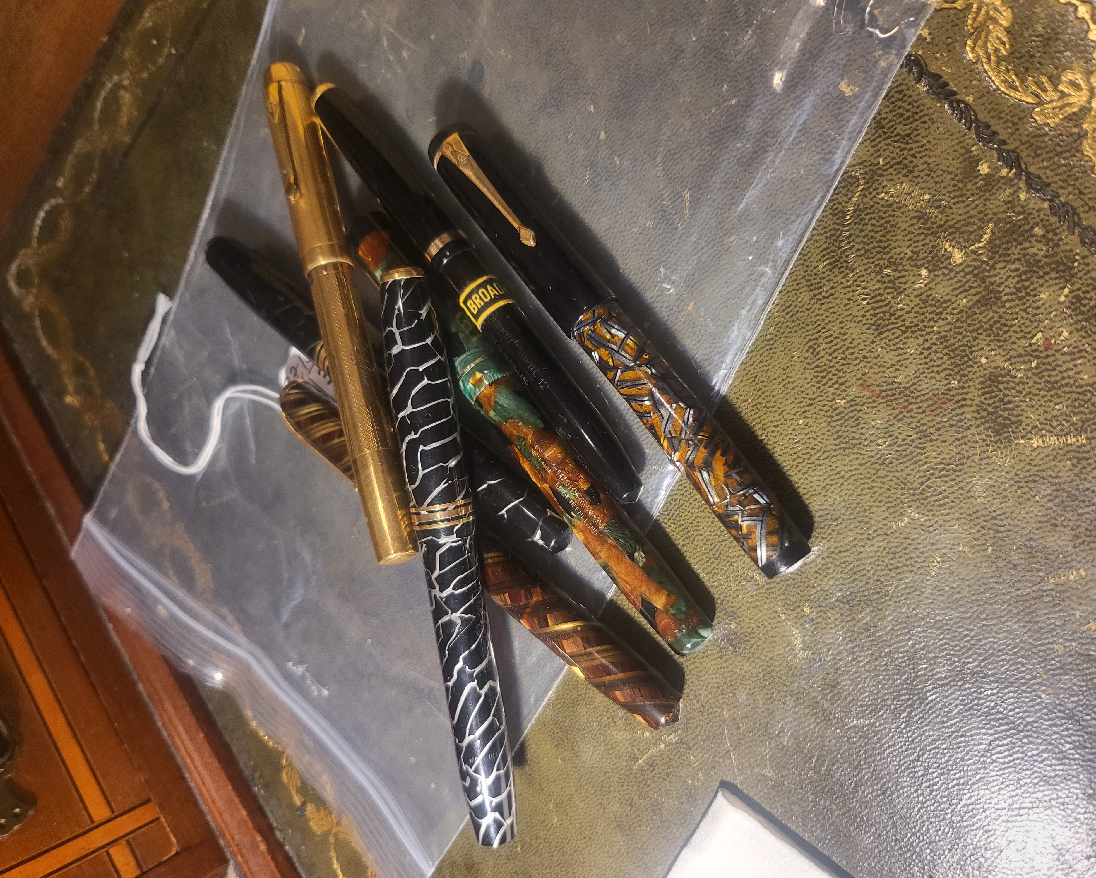 Molto belle le celluloidi (o caseina) Conway Stewart, mi sembra di vedere anche una Tiger Eye.