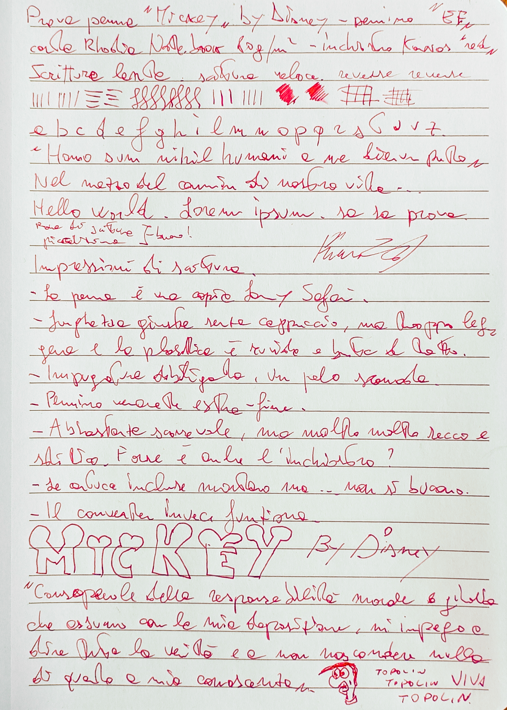 La penna è leggerissima e della plastica più leggera che mi sia capitato di maneggiare, ma... ha una bella scatoletta, è accompagnata da converter e due cartucce di inchiostro, ha una spilla e una clip di Topolino (da applicare al fermagio della penna stessa) e soprattutto, non facile da immaginare, scrive più che decentemente.
