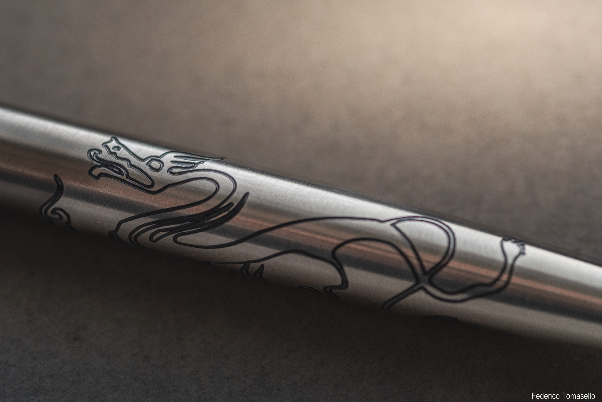 Non sembrerebbe un buon biglietto da visita, ma in realtà l'ho scelta anche perché è in metallo (e ho capito di preferirle) e ha una simpatica incisione di un drago, che mi è sembrata una cosa carina proprio nei giorni in cui arrivava l'annuncio della dipartita da questo mondo di Akira Toriyama, l'autore di "Dragon Ball".