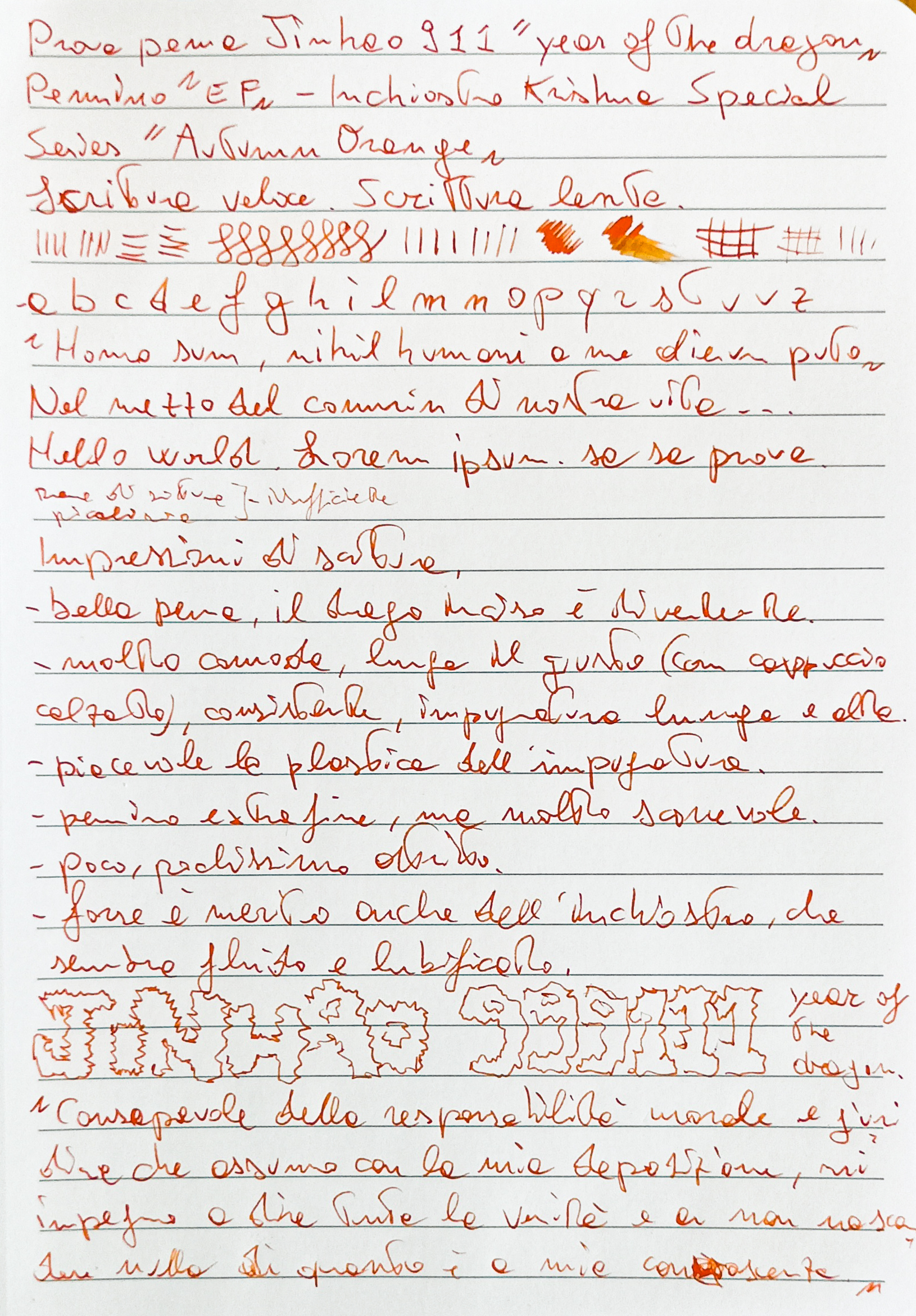 L'ho abbinata ad un inchiostro indiano Krishna "Autumn Orange", anche se per errore: ero indeciso se utilizzare il rosso o il verde della stessa serie (più adatte all'idea di drago), ma ho confuso le boccette.