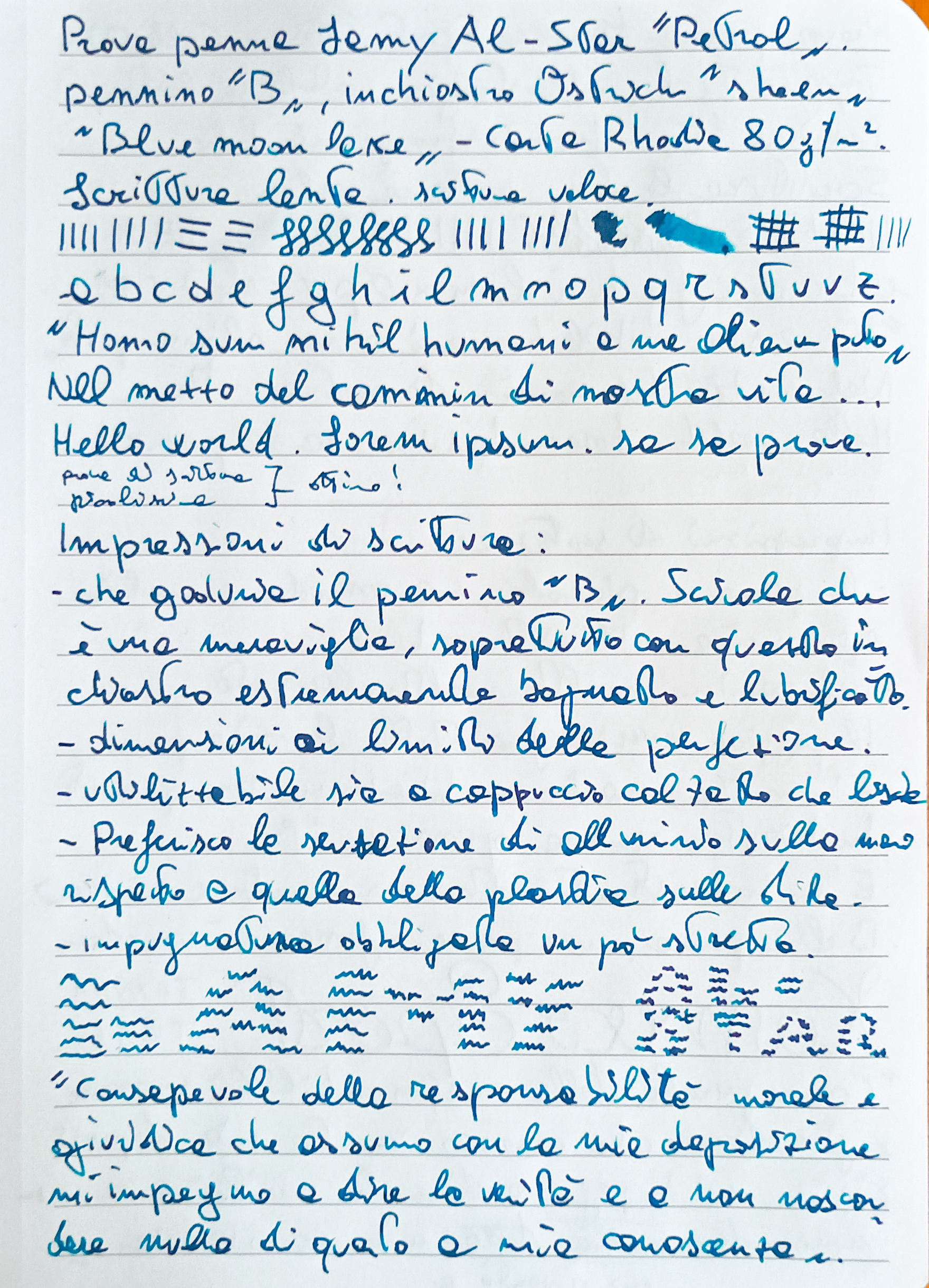 L'ho caricata con l'inchiostro Ostrich "Sheen" Blue Moon Lake, che già di suo è un inchiostro notevolmente fluido e lubrificato: in abbinamento al pennino B, lascia una copiosa quantità di liquido sulla carta, rendendo la scrittura quasi saponettosa.