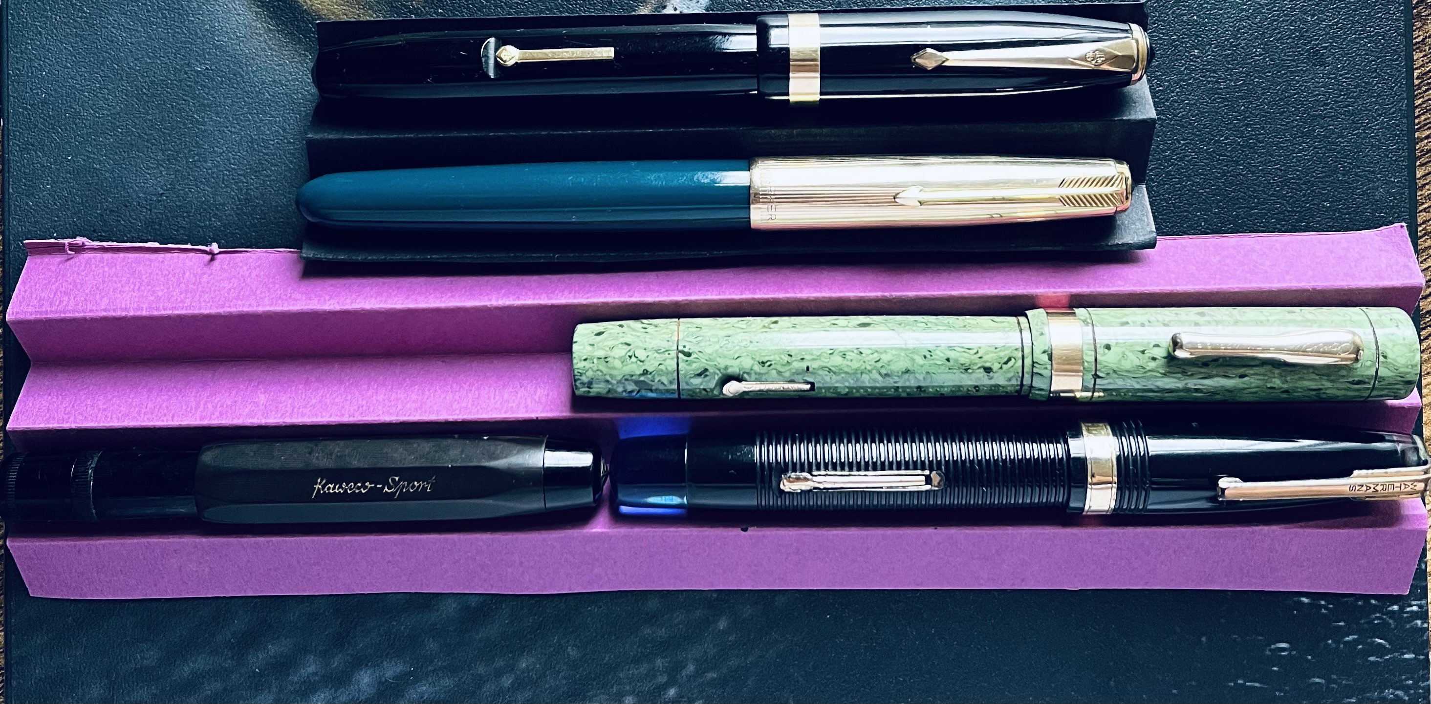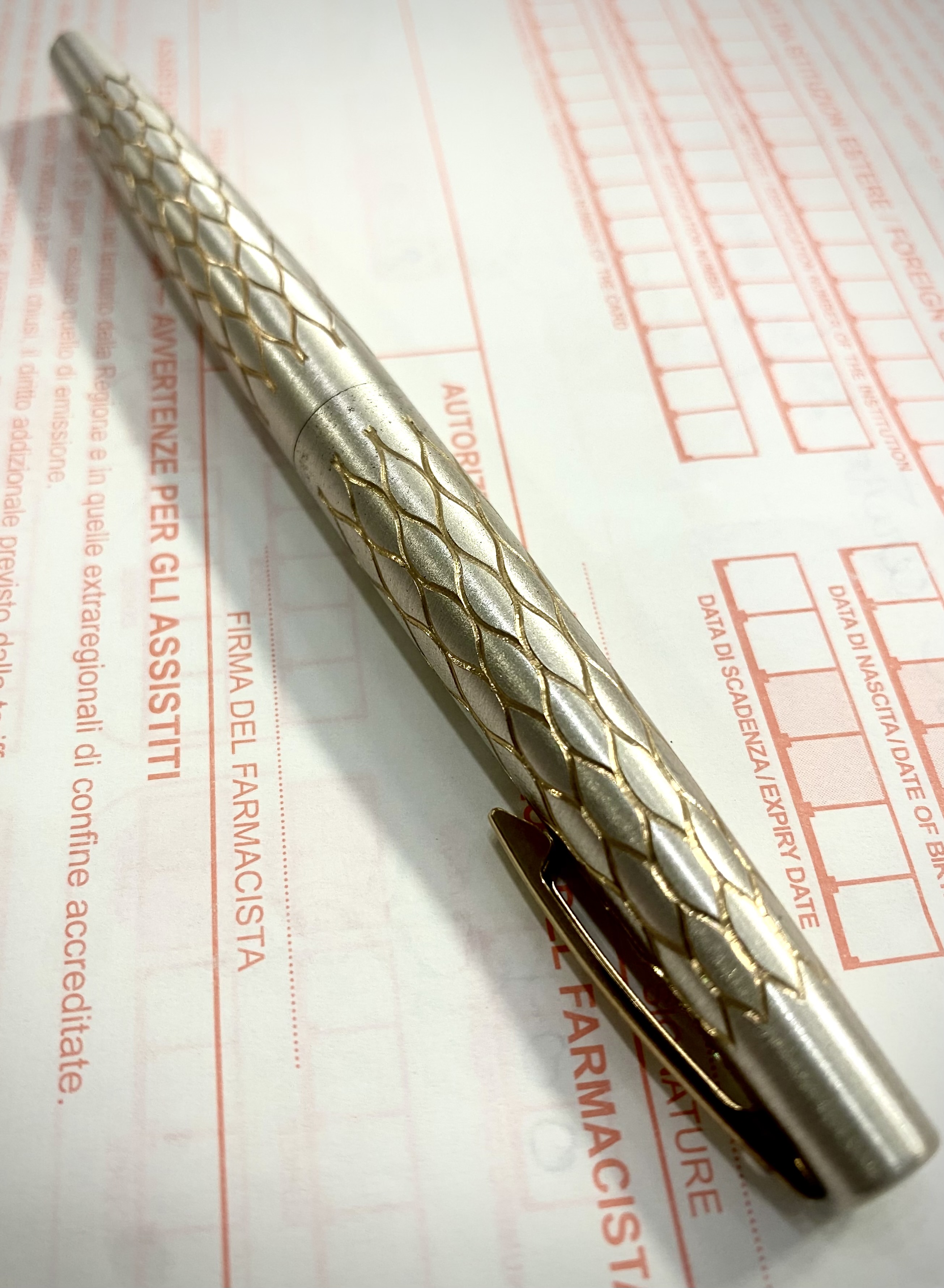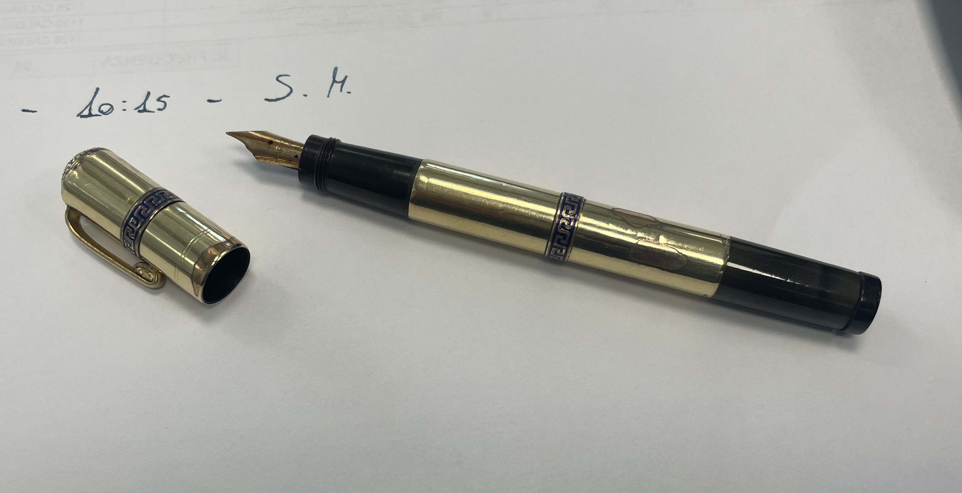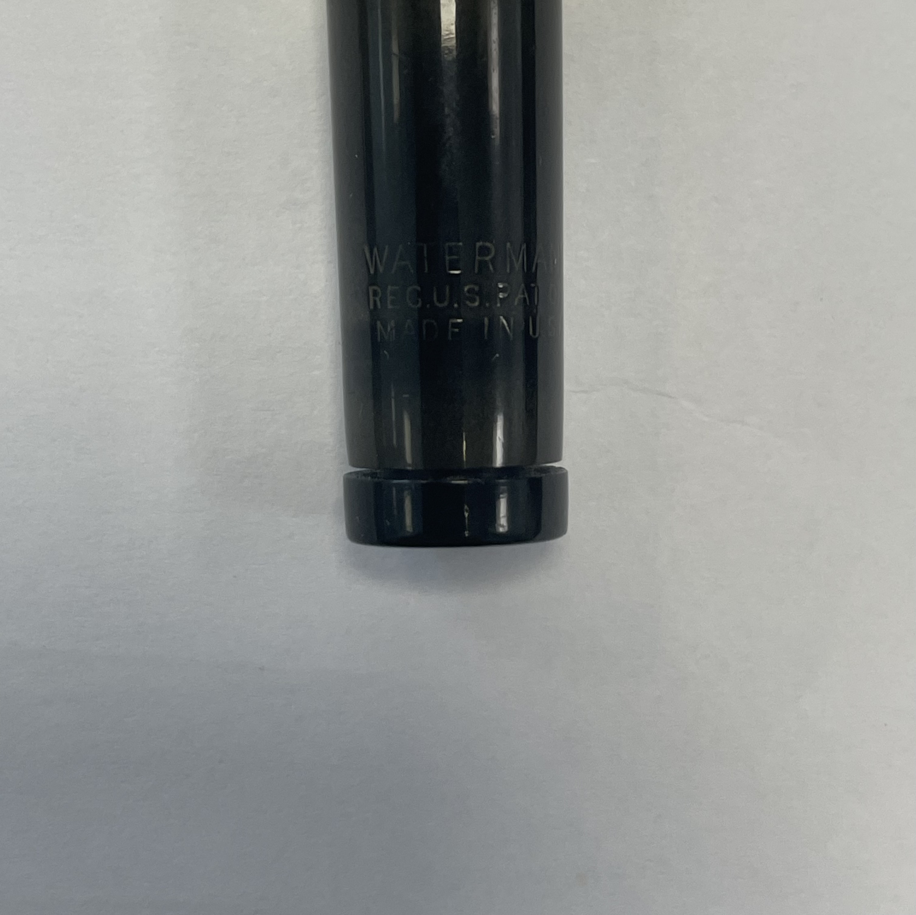 Una Waterman 42, a cui ho sostituito la guarnizione di fondo con un o-ring, purtroppo la laminatura è decisamente rovinata, la clip non sua ed il pennino è di una Parker Duofold… ma ora funziona perfettamente