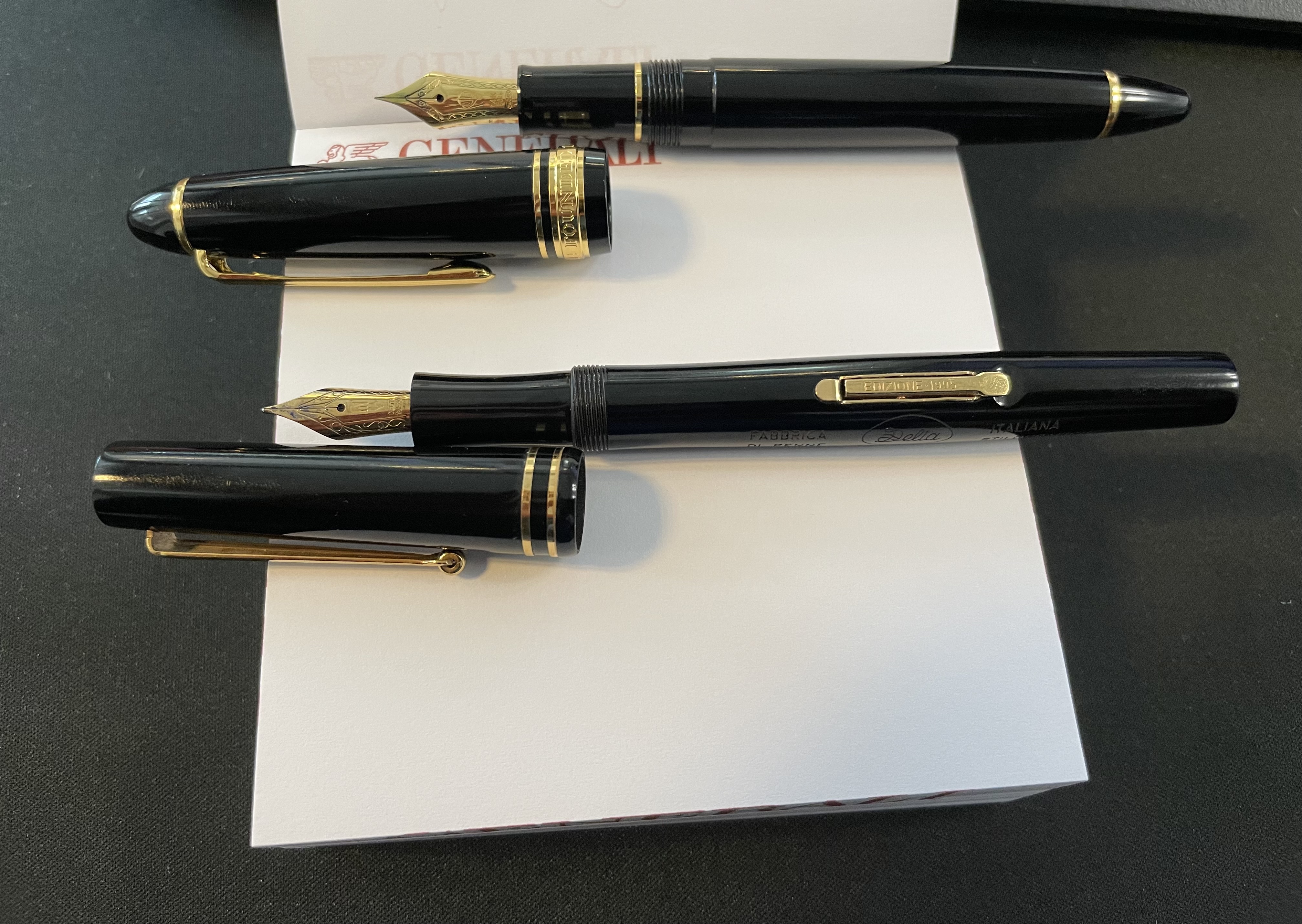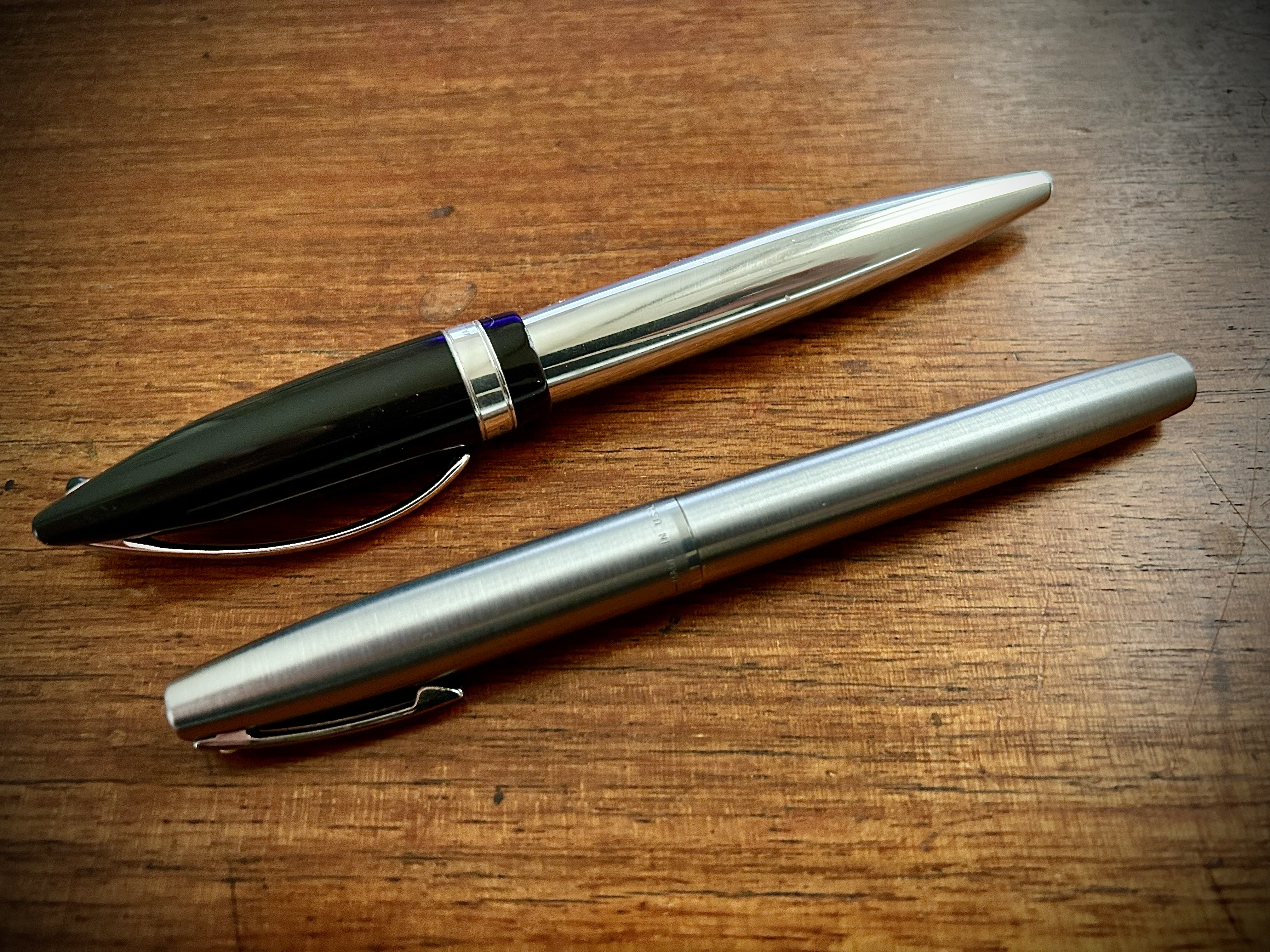 Pineider Egosphere, pennino M, con vecchio Pelikan Blu-nero ferrogallico e Sheaffer Imperial, pennino stub, con Aurora blu.