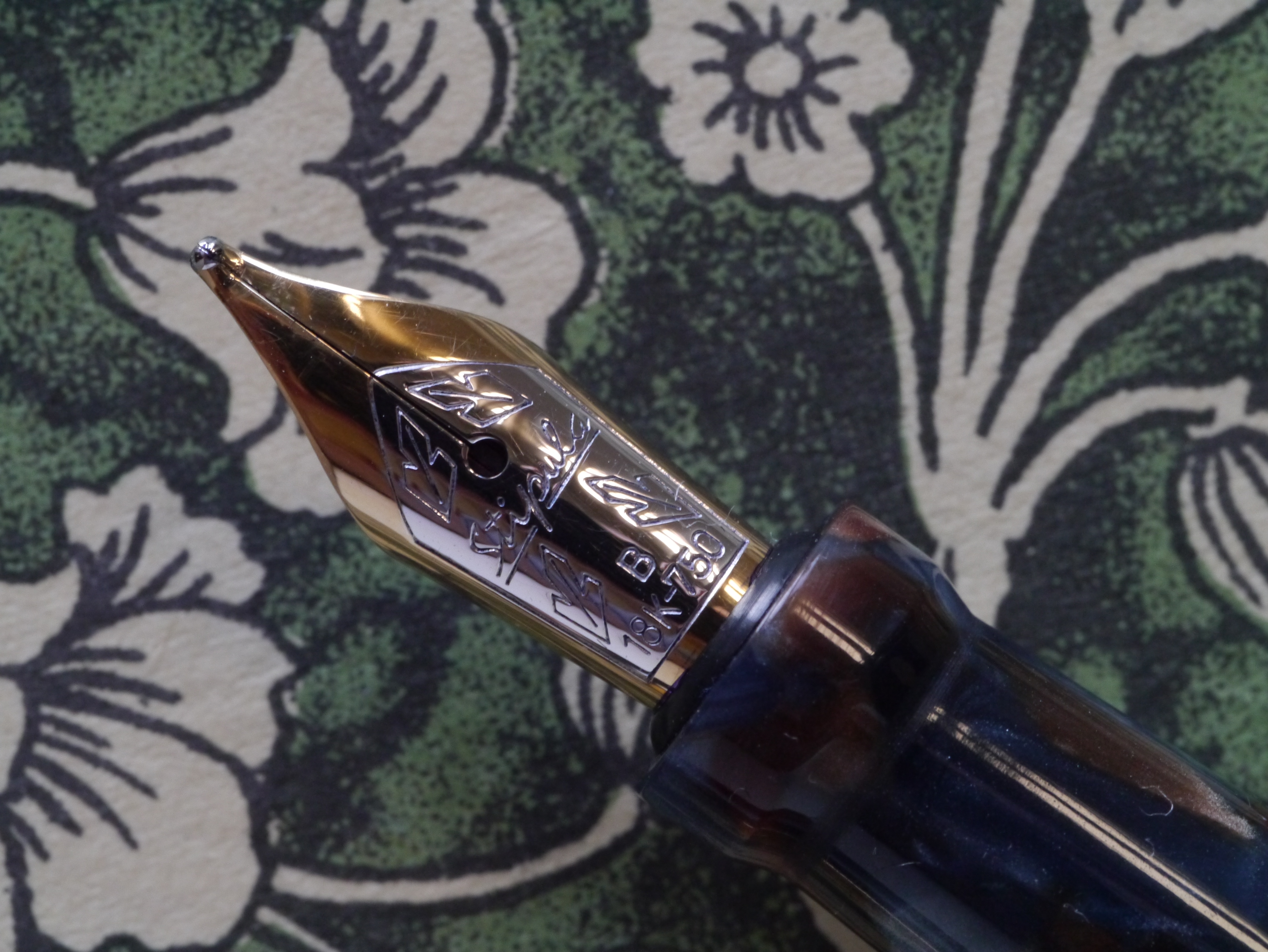 "Il principio è lo stesso, le incisioni vengono fatte dal foro di respirazione verso l'esterno fino ai bordi del pennino. Più strette e lunghe vengono fatte le punte, più flessibilità e morbidezza otteniamo, ma se sono troppo strette il pennino potrebbe diventare delicato. Di solito non faccio un foro nel pennino, ma piuttosto una forma a freccia, e uso la forma a freccia per tenere un pezzo di rete flessibile, o saldare un pezzo di metallo sulla forma per tenere meglio la rete. La rete funge da sovraalimentazione che ha contatto diretto con l'alimentatore primario. Se usata con un alimentatore ad alto flusso (io uso alimentatori in polimero Good Blue ma l'ebanite dovrebbe funzionare anche), il flusso di inchiostro può tenere il passo con enormi quantità di flessibilità, ad esempio: