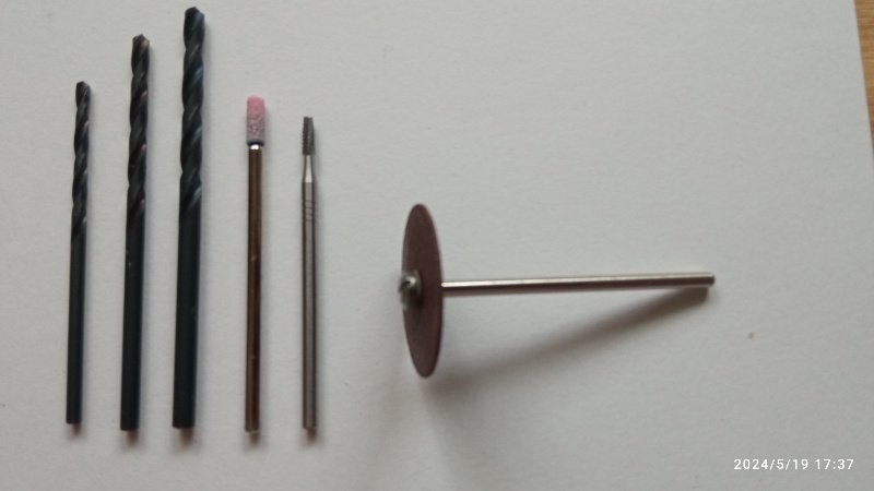 Three drill bits to gently enlarge the breather hole. Then we have two bits: the first is a corundum grinding wheel, and the second is a tungsten carbide cutter. They are equivalent and are used to shape the hole as you need, whether lengthening it downward or making it oval to increase its area. The last accessory, when used on its edge, can be used to extend the cut of the nib toward the base. So far, I haven't used it because it's not easy for me to work precisely with this accessory. But there are people here who have done it successfully. The corundum grinding wheel has a diameter of 2.5 mm, just for reference.