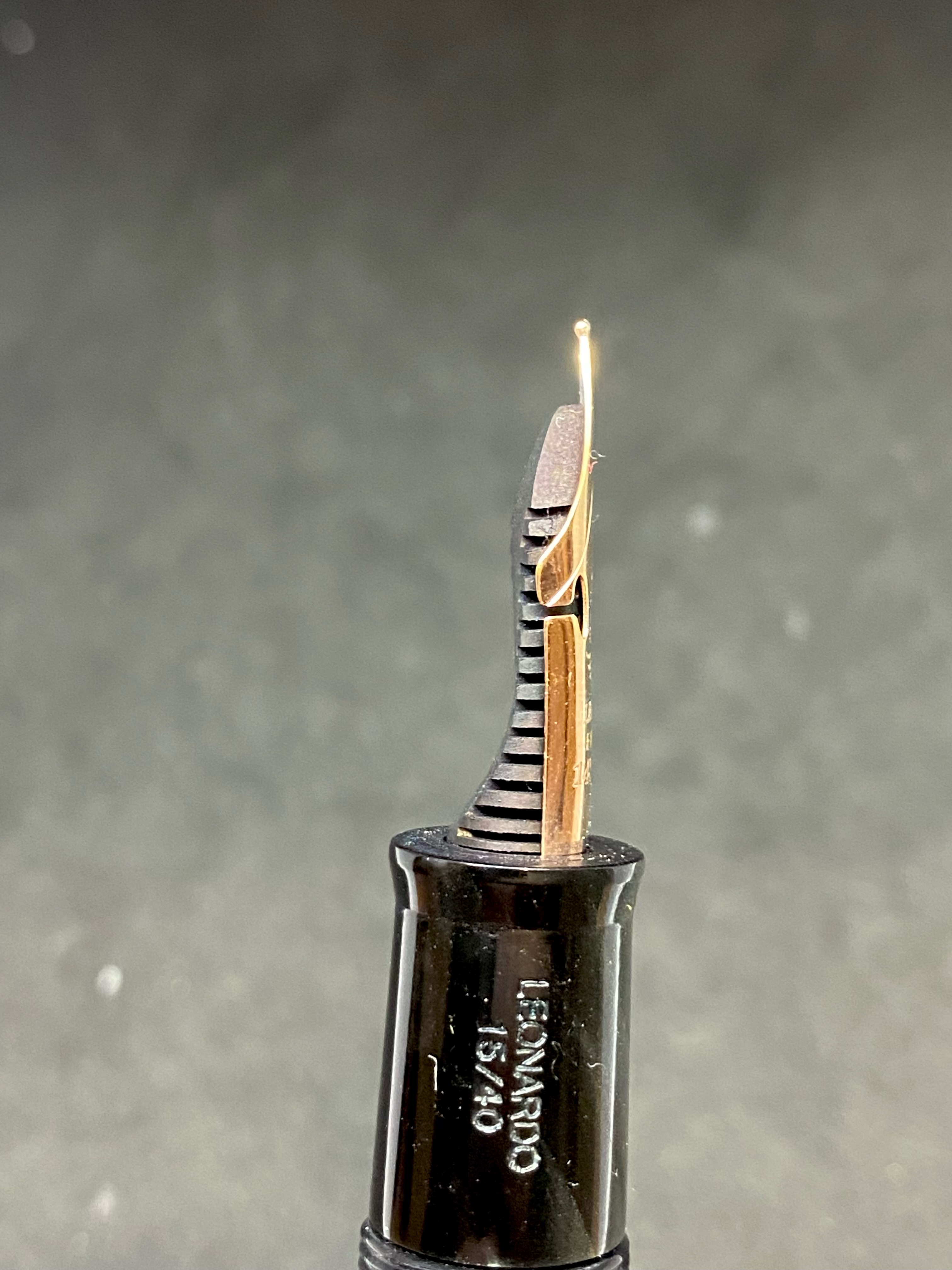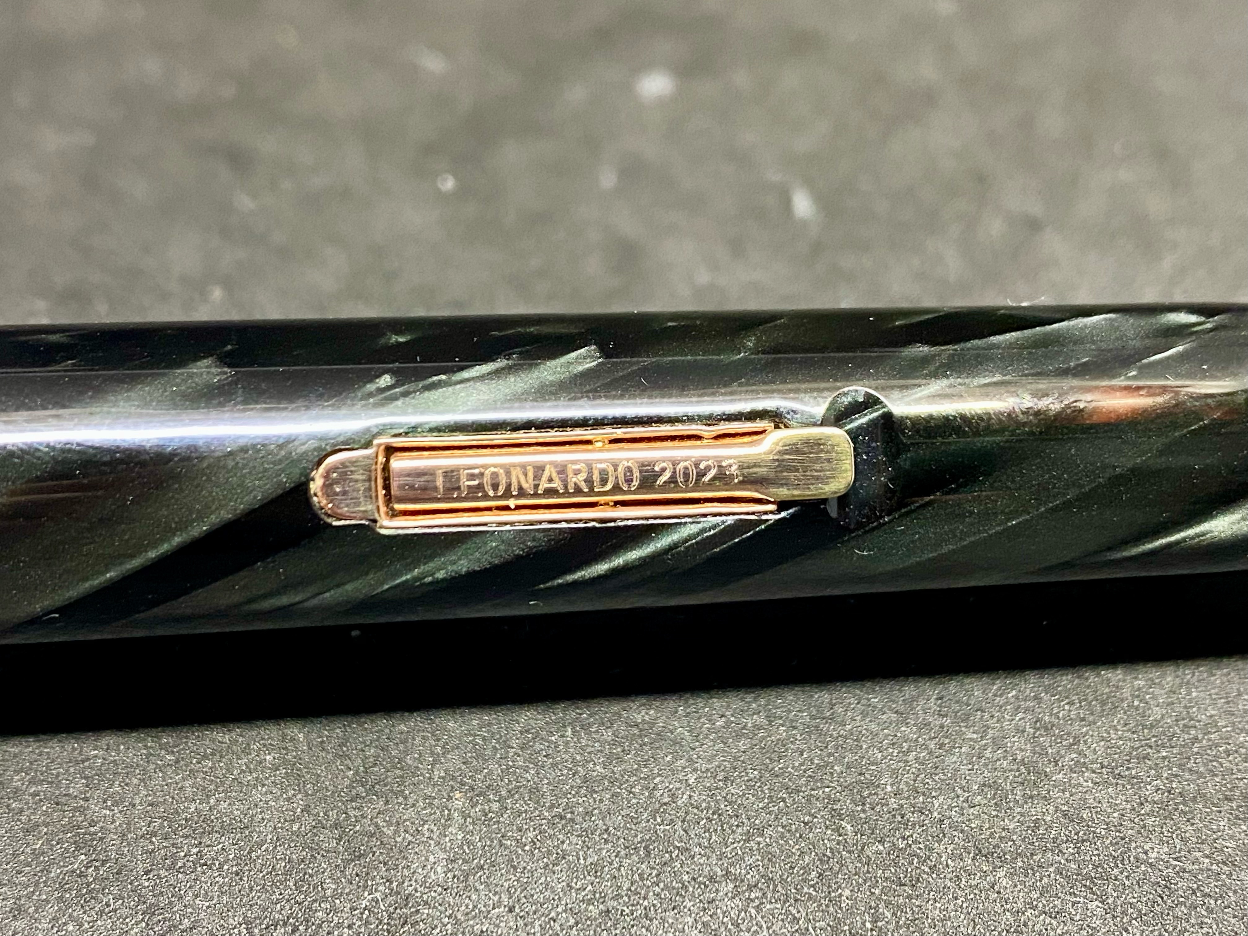 Leonardo non ha voluto deturpare il fusto neanche con l'incisione del brand, si è limitato a incidere "Leonardo 2023" sulla levetta, e discretamente il numero di serie sotto "Leonardo" sul lato sinistro della sezione guardando il pennino dall'alto.