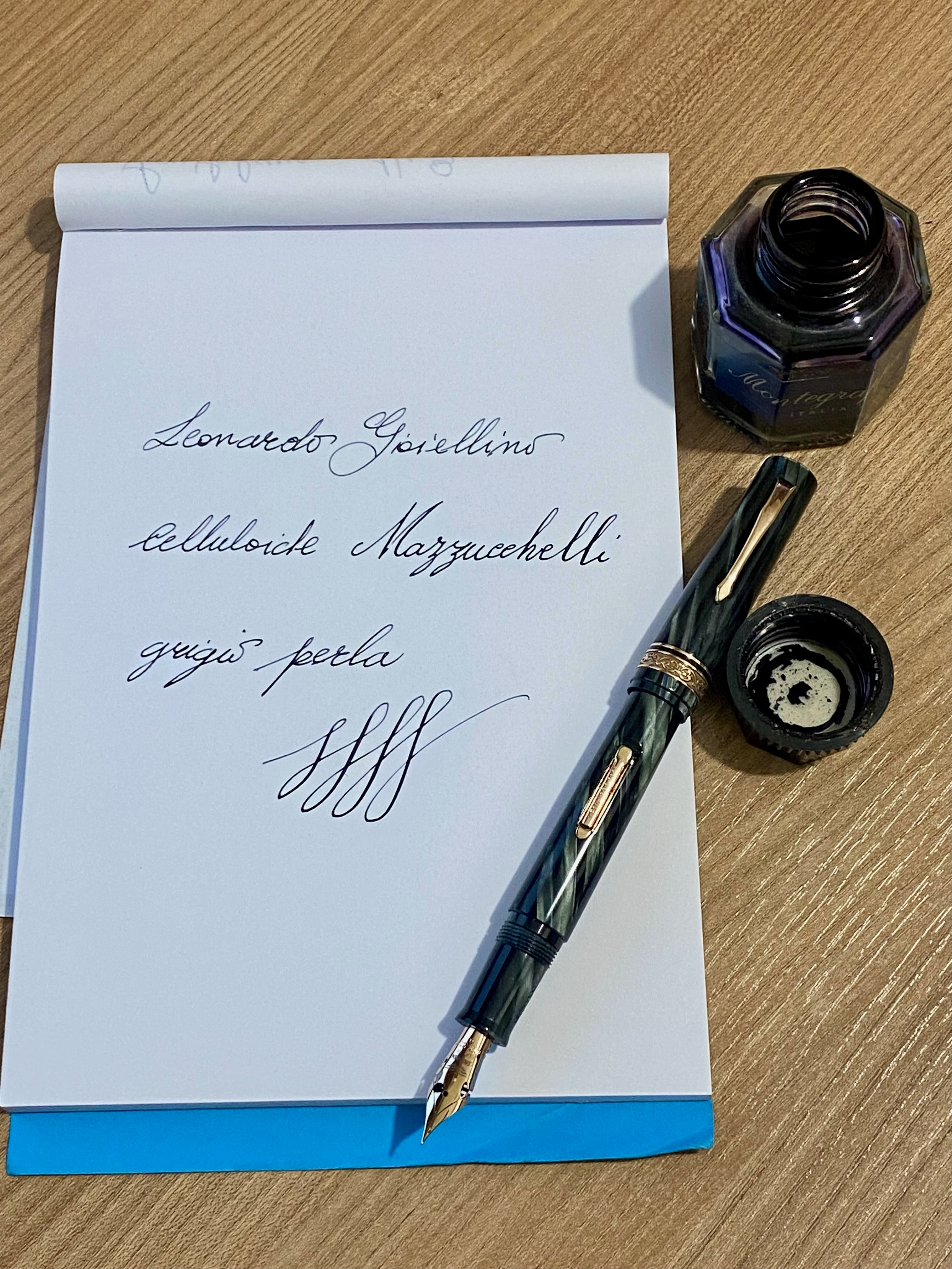 Il sistema di ricarica della penna, se non si era ancora capito, è la levetta laterale, del resto quale sistema di ricarica avrebbe potuto essere più indicato per una penna così classica. Quando allineati, clip, levetta e pennino formano quella linea immaginaria che, attraverso la nostra mano, è la strada su cui i nostri pensieri viaggiano fino a materializzarsi tramite l'inchiostro sulla carta. E da buona penna a levetta, la Leonardo Gioiellino va usata con il cappuccio calzato per godere della sua estetica appieno, si sbilancia un po' all'indietro, ma il vero problema non è tanto questo quanto riuscire a guardare cosa scriviamo piuttosto che rimirare la penna! La levetta è l'unico elemento degno di convivere con la bellezza sprigionata da questa celluloide con le sue nuance grigio/nero. Un materiale che, rigirandolo tra le dita, irradia una sua luce interna più luminosa laddove l'argentea materia fluttua più in superficie in questo mare notturno, e che resta velatamente nascosta quando vi si inabissa ed a prevalere è il grigio scuro.