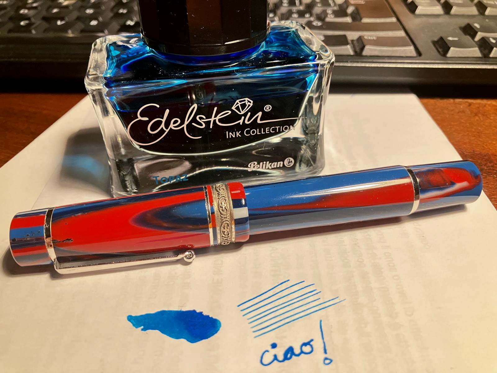 stimolato dal 3d, ieri ho ripreso in mano la versione Gallery Blue Moon (catturata fortuitamente all'ultimo pen show di Bologna) e caricata con Edelstein Topaz (scoprendo che si abbina), che finora mi ero rifiutato di comprare (perché "troppo turchese").